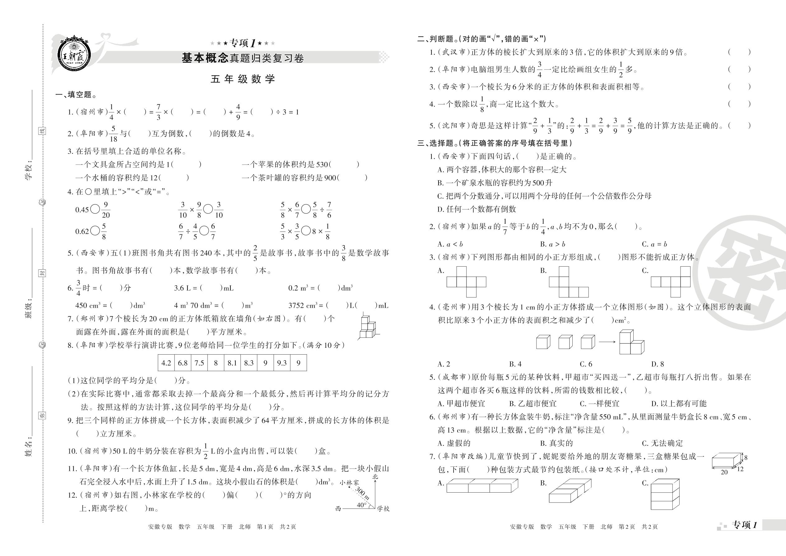 王朝霞期末专项卷——基本概念、计算真题归类复习五年级下册数学(北师版)【0】