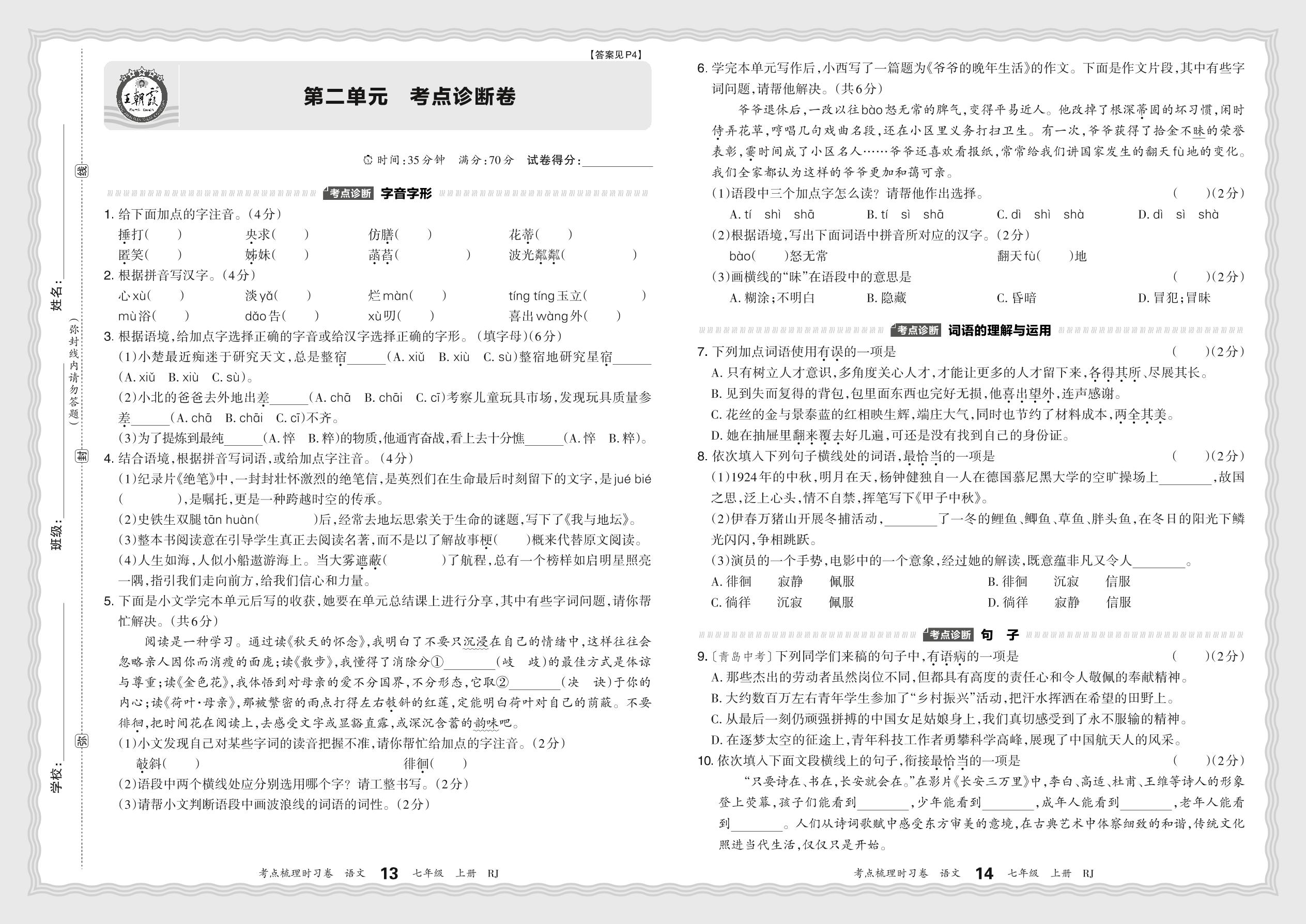 2024秋上册七年级语文人教版 第二单元 考点诊断卷