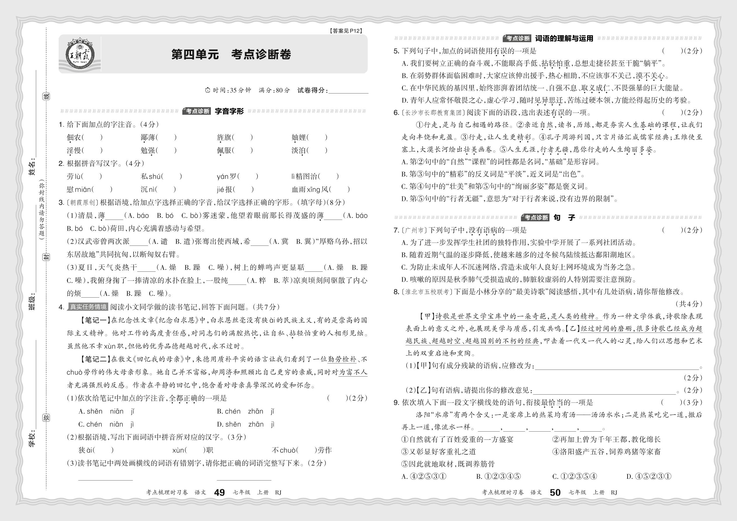 2024秋上册七年级语文人教版 第四单元 考点诊断卷