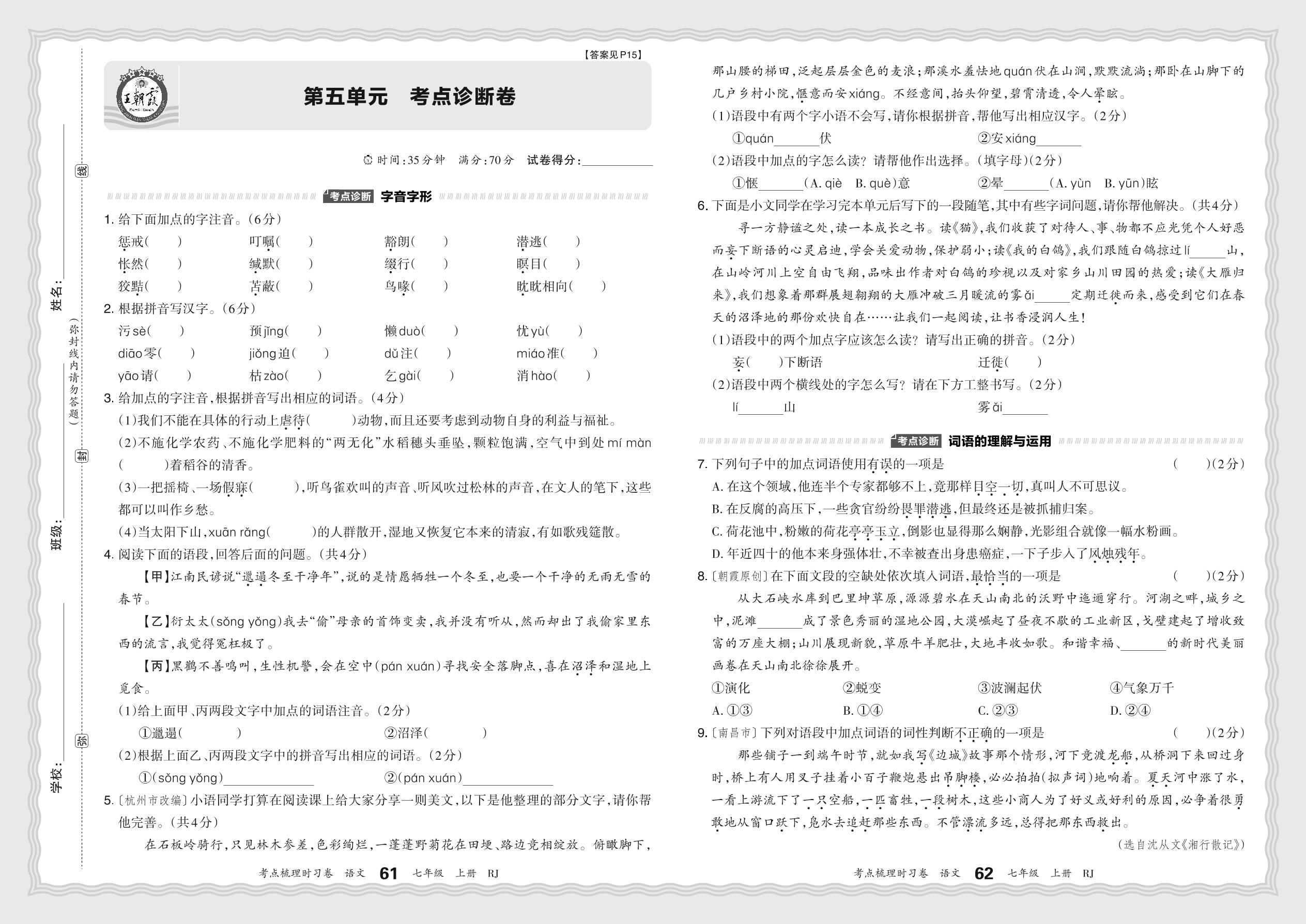 2024秋上册七年级语文人教版 第五单元 考点诊断卷