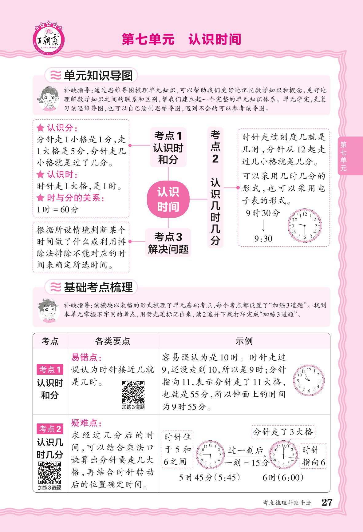 2024秋上册二年级数学人教版 考点梳理补缺手册——第七单元 认识时间