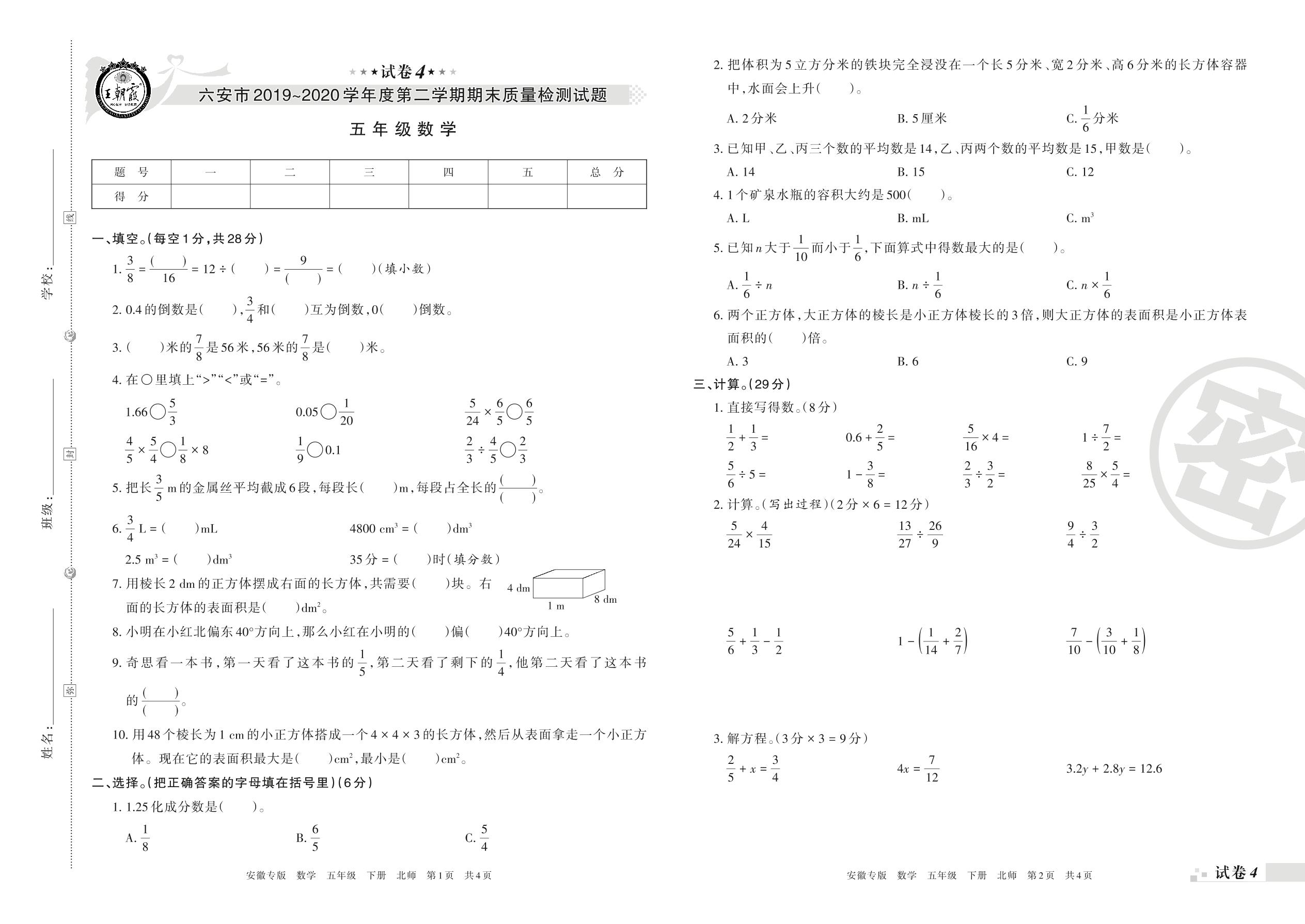 2019-2020学年第二学期六安市五年级数学试卷(北师版)【4】