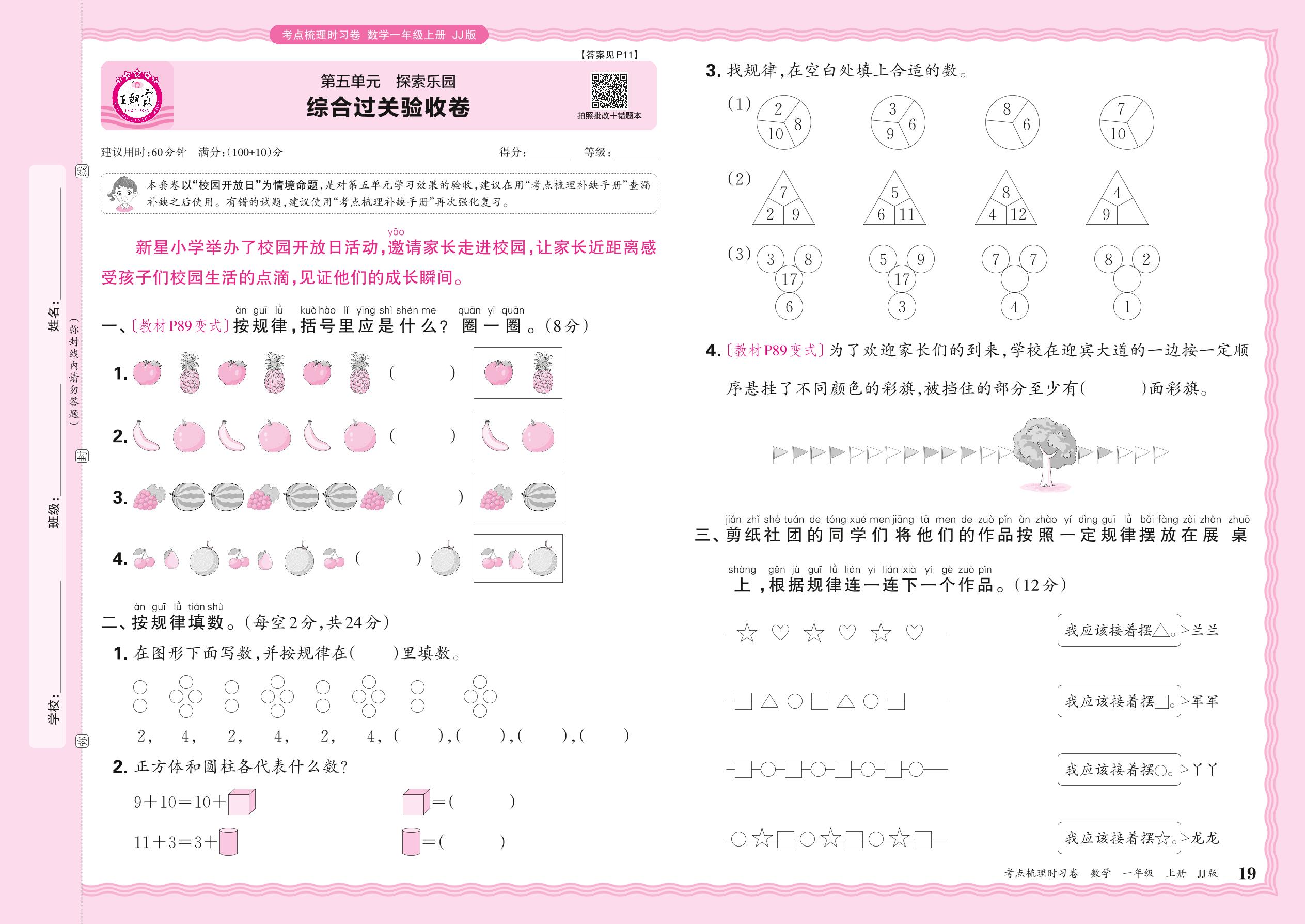 2024秋上册一年级数学冀教版 第五单元 综合过关验收卷