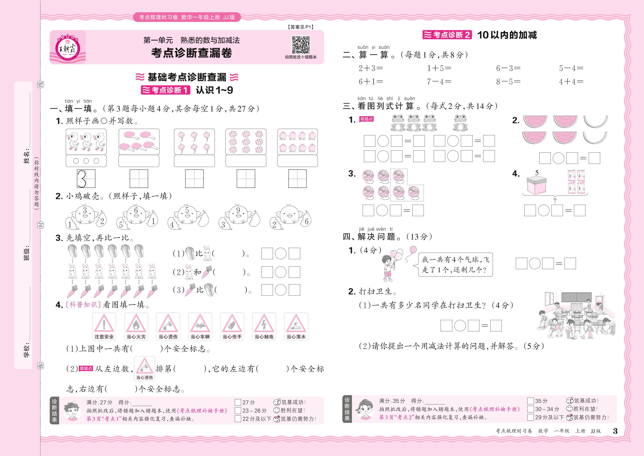 2024秋上册一年级数学冀教版 第一单元 考点诊断查漏卷