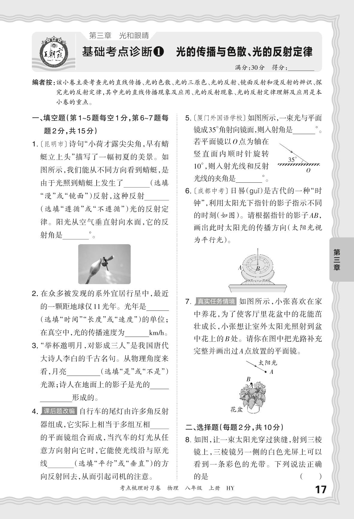2024秋上册八年级物理沪粤版 第三章 基础考点诊断1 光的传播与色散、光的反射定律