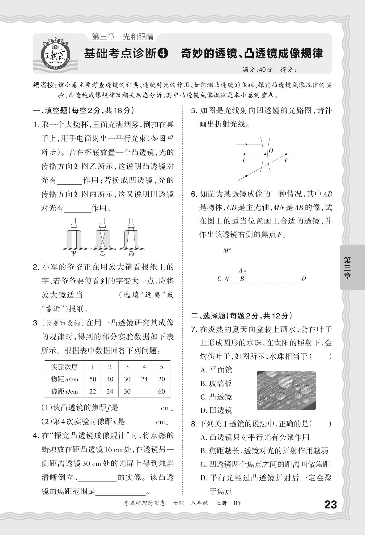 2024秋上册八年级物理沪粤版 第三章 基础考点诊断4 奇妙的透镜、凸透镜成像规律