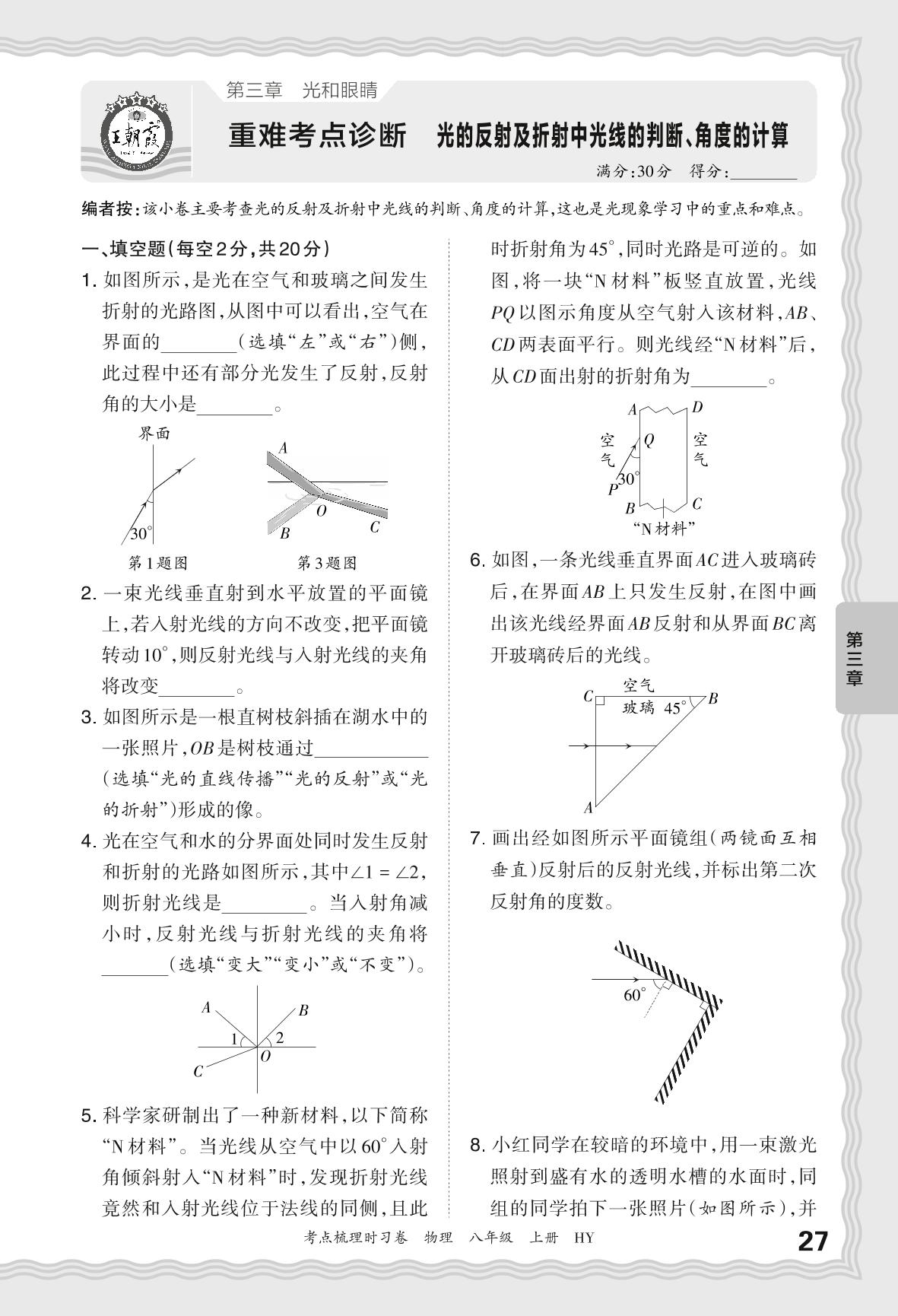 2024秋上册八年级物理沪粤版 第三章 重难考点诊断 光的反射及折射中光线的判断、角度的计算