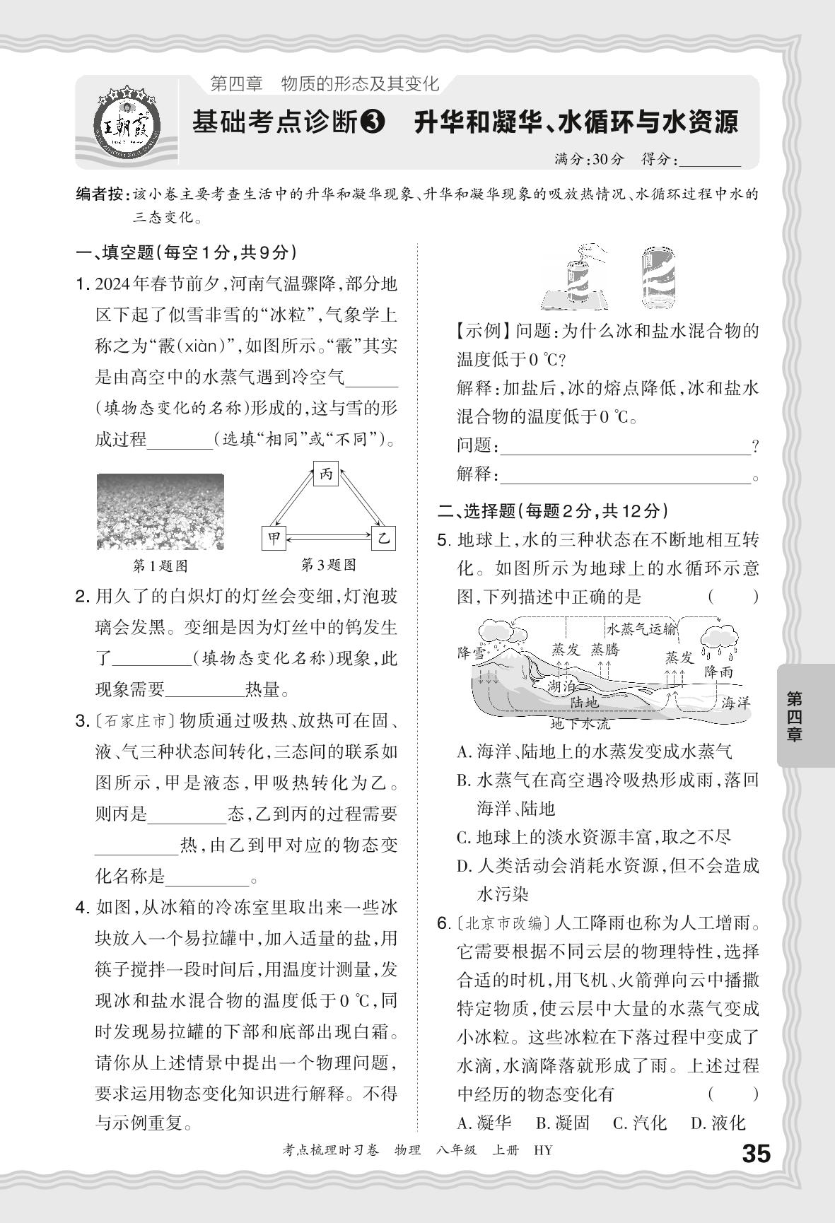 2024秋上册八年级物理沪粤版 第四章 基础考点诊断3 升华和凝华、水循环与水资源