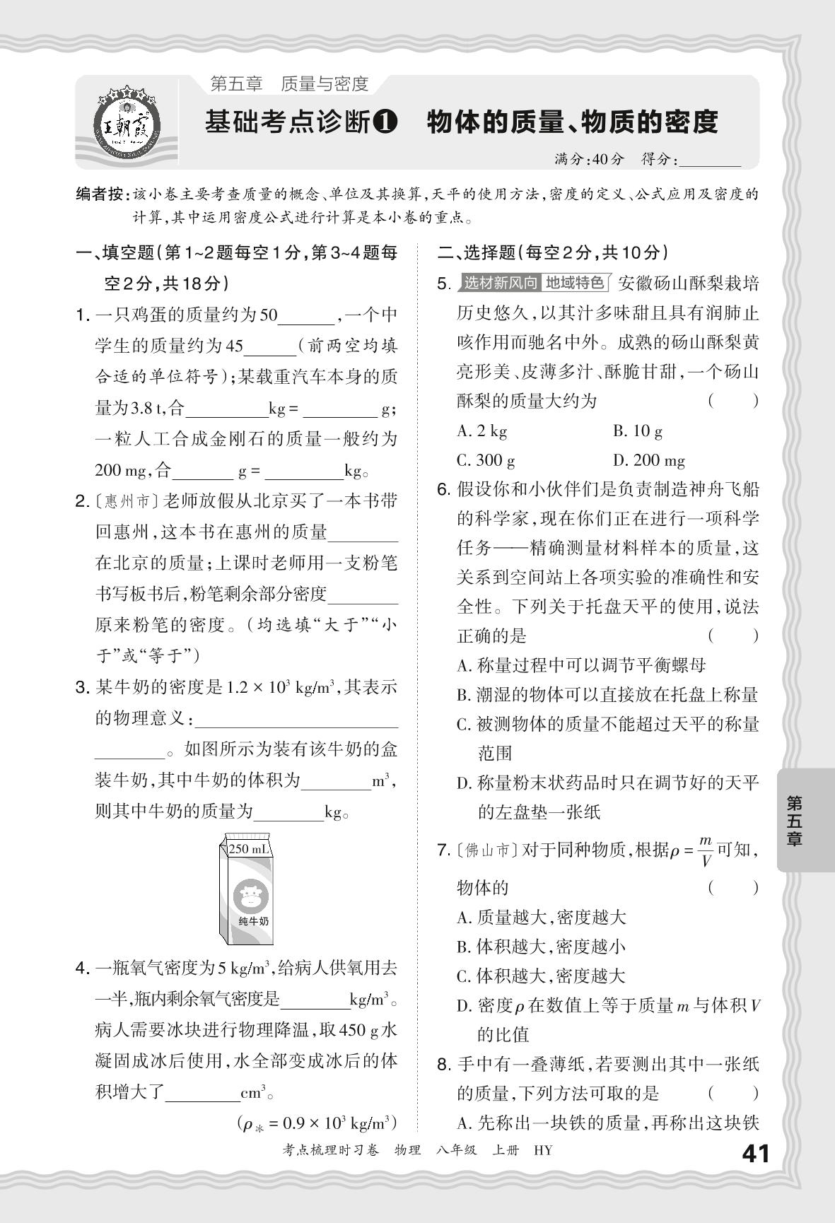 2024秋上册八年级物理沪粤版 第五章 基础考点诊断1 物体的质量、物质的密度