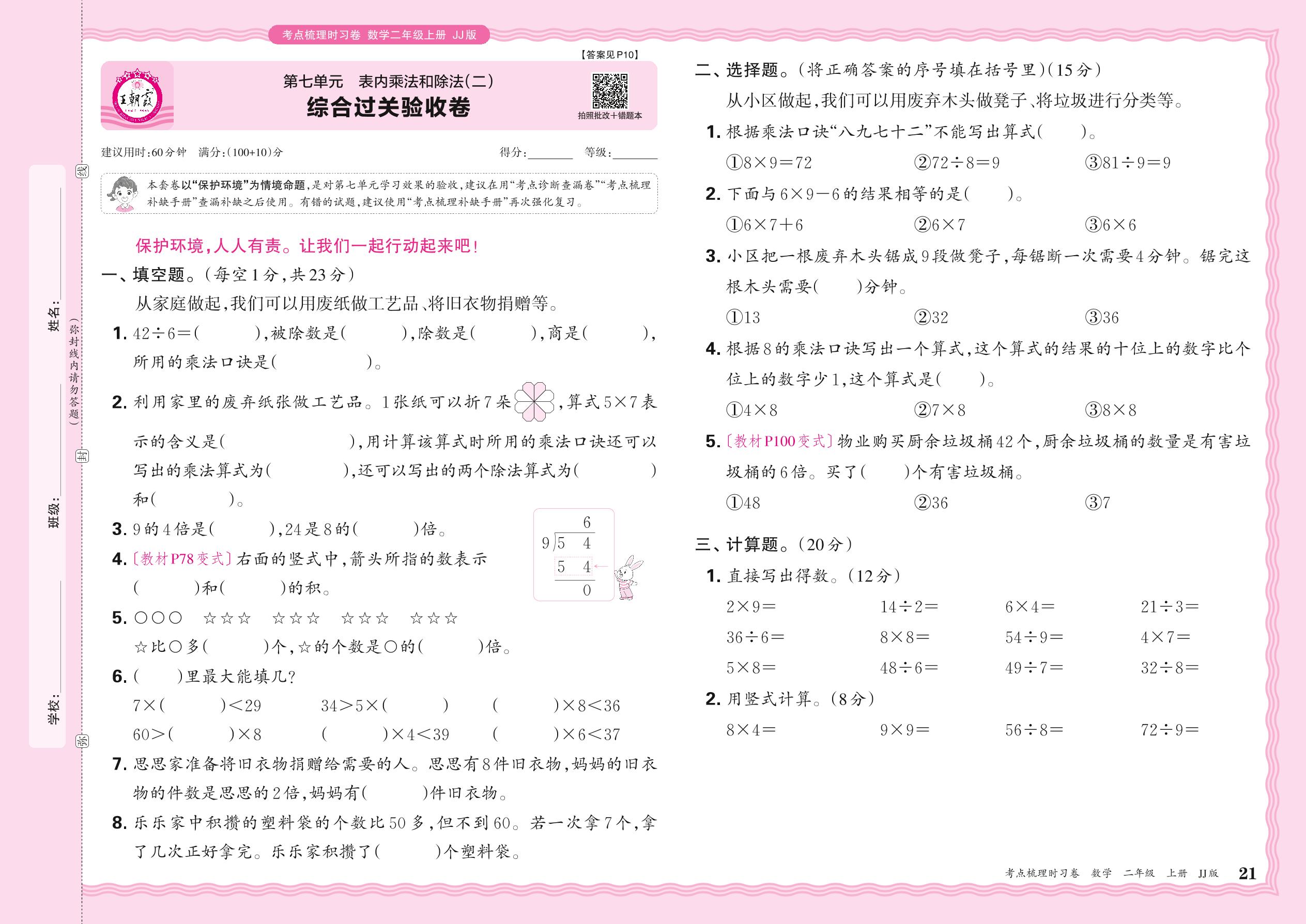 2024秋上册二年级数学冀教版 第七单元 综合过关验收卷