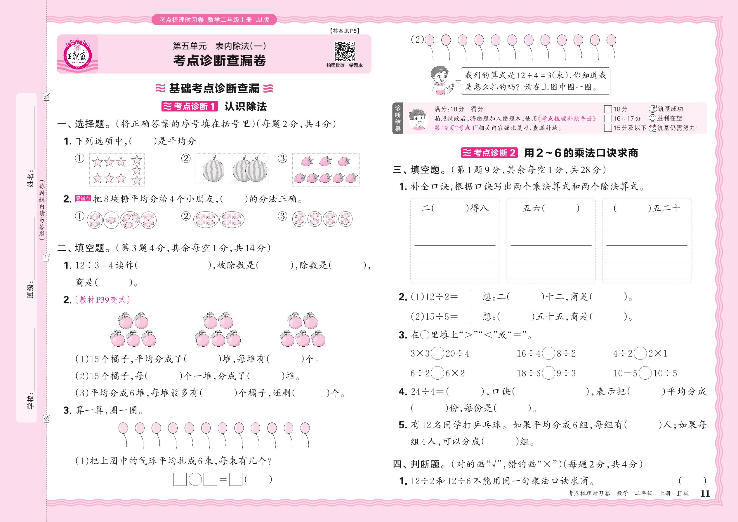 2024秋上册二年级数学冀教版 第五单元 考点诊断查漏卷