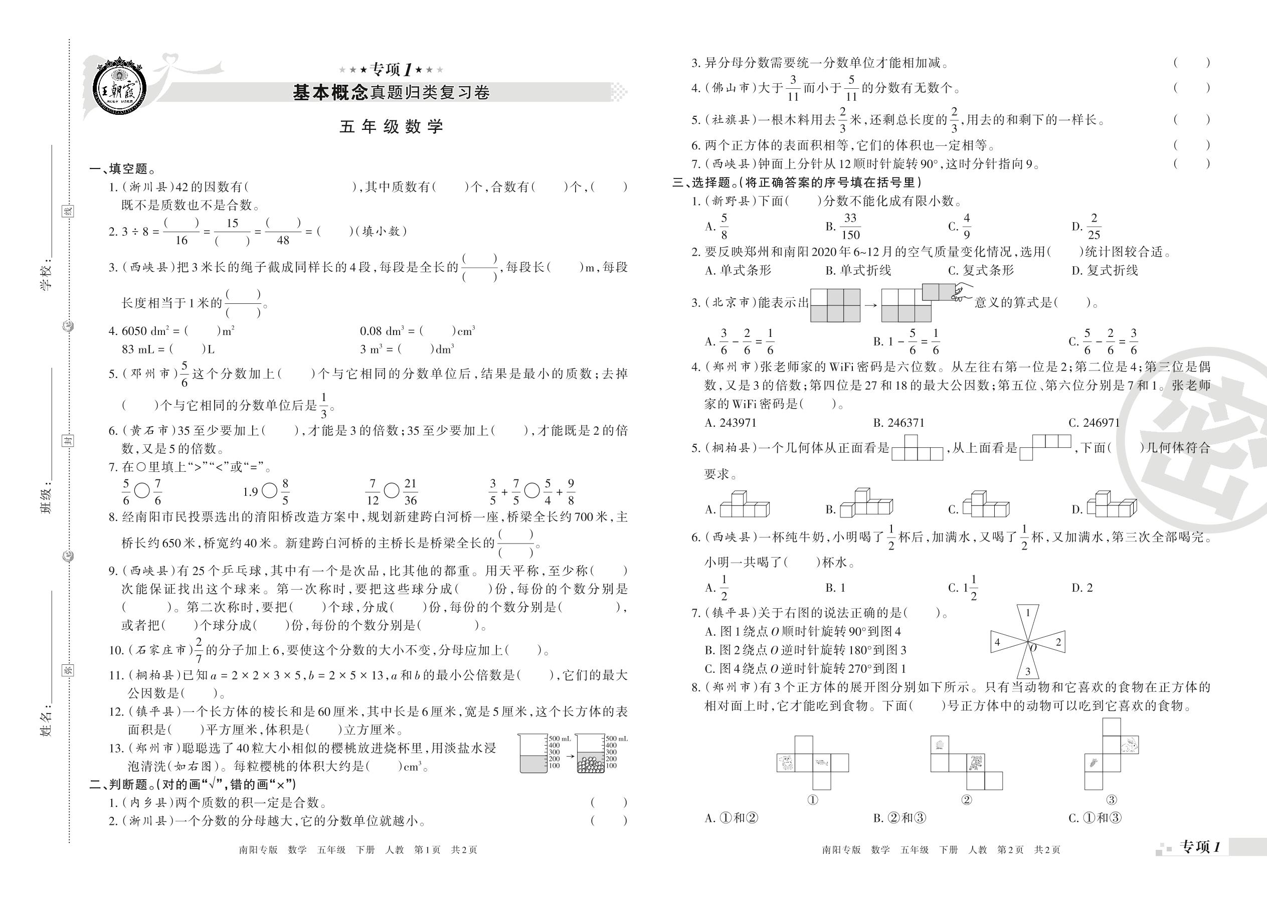 王朝霞期末专项卷——基本概念、计算真题归类复习五年级下册数学(人教版)【0】