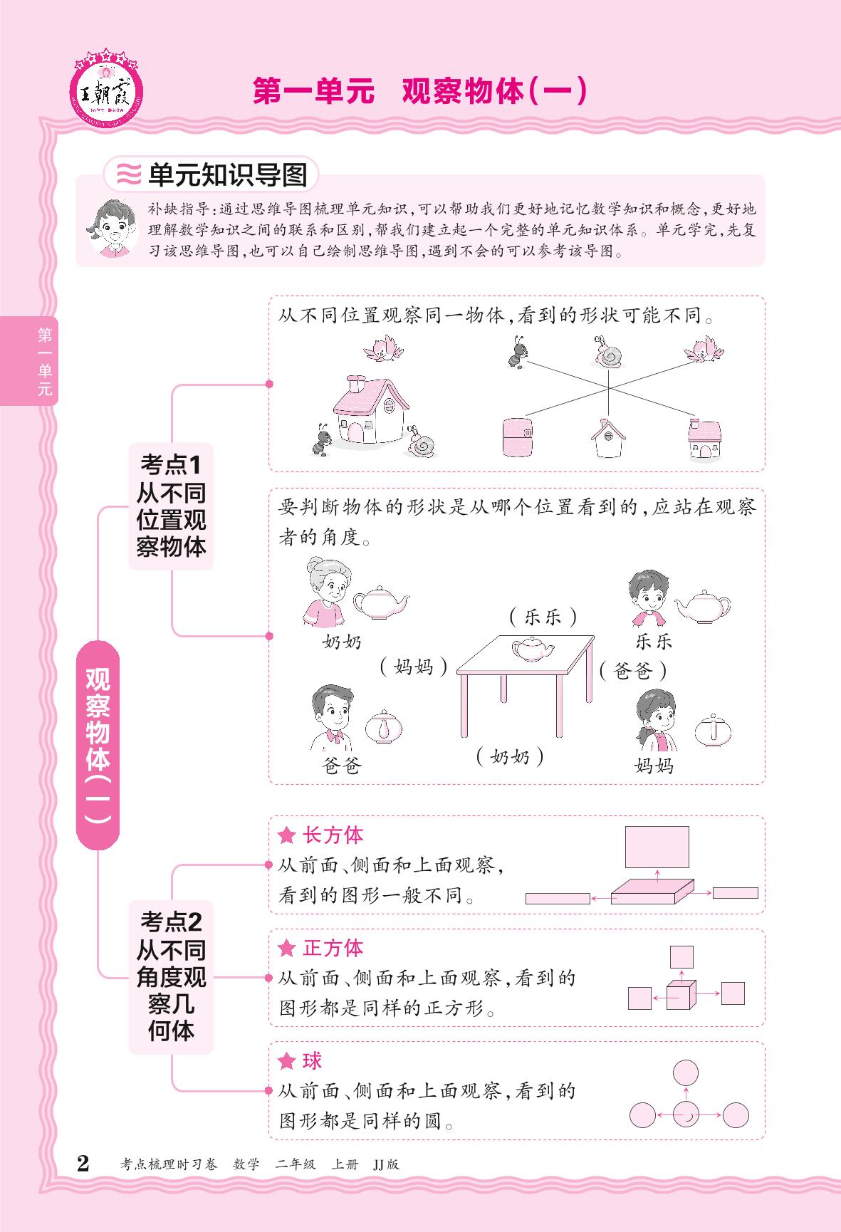 2024秋上册二年级数学冀教版 考点梳理补缺手册——第一单元 观察物体(一)