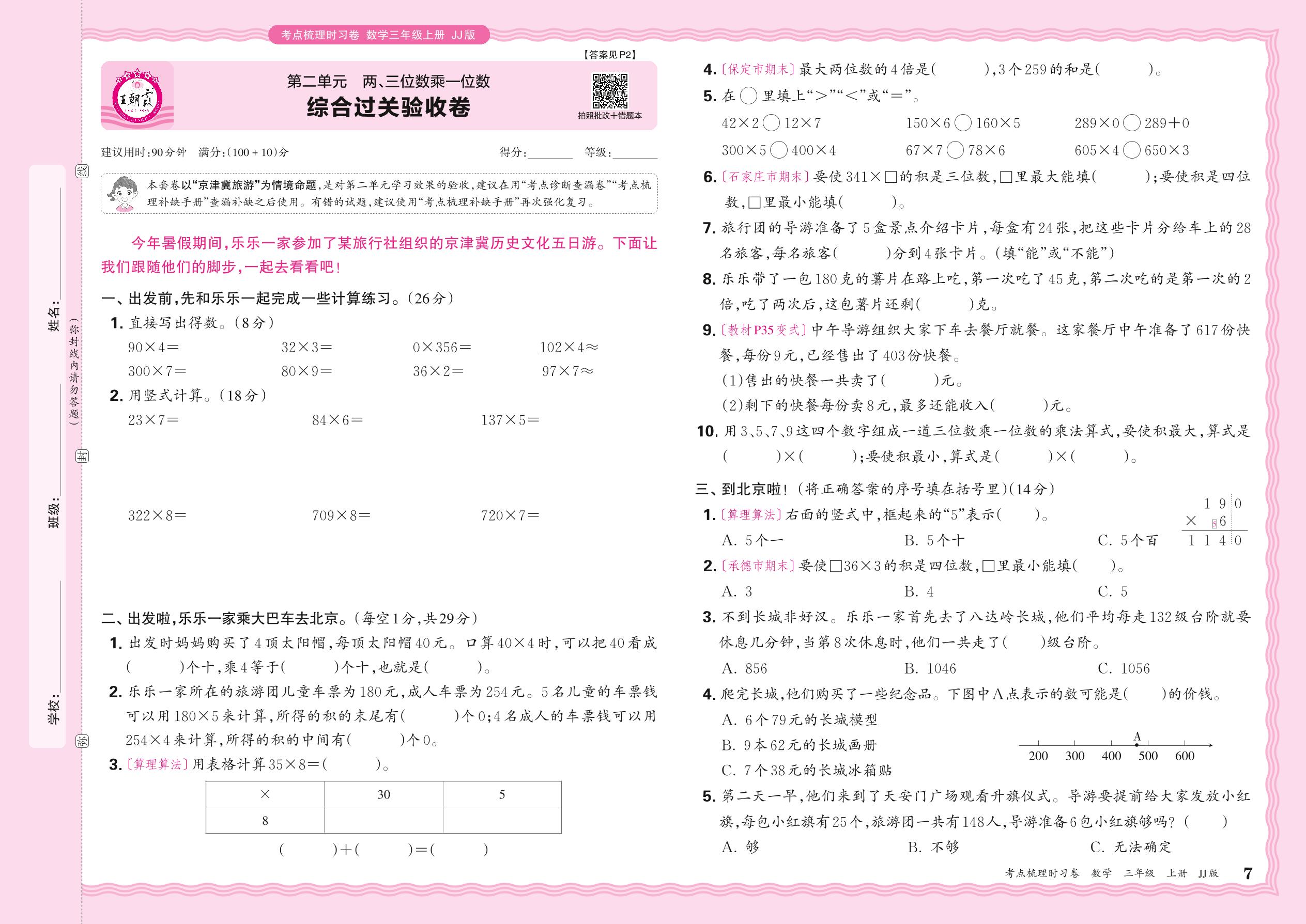 2024秋上册三年级数学冀教版 第二单元 综合过关验收卷