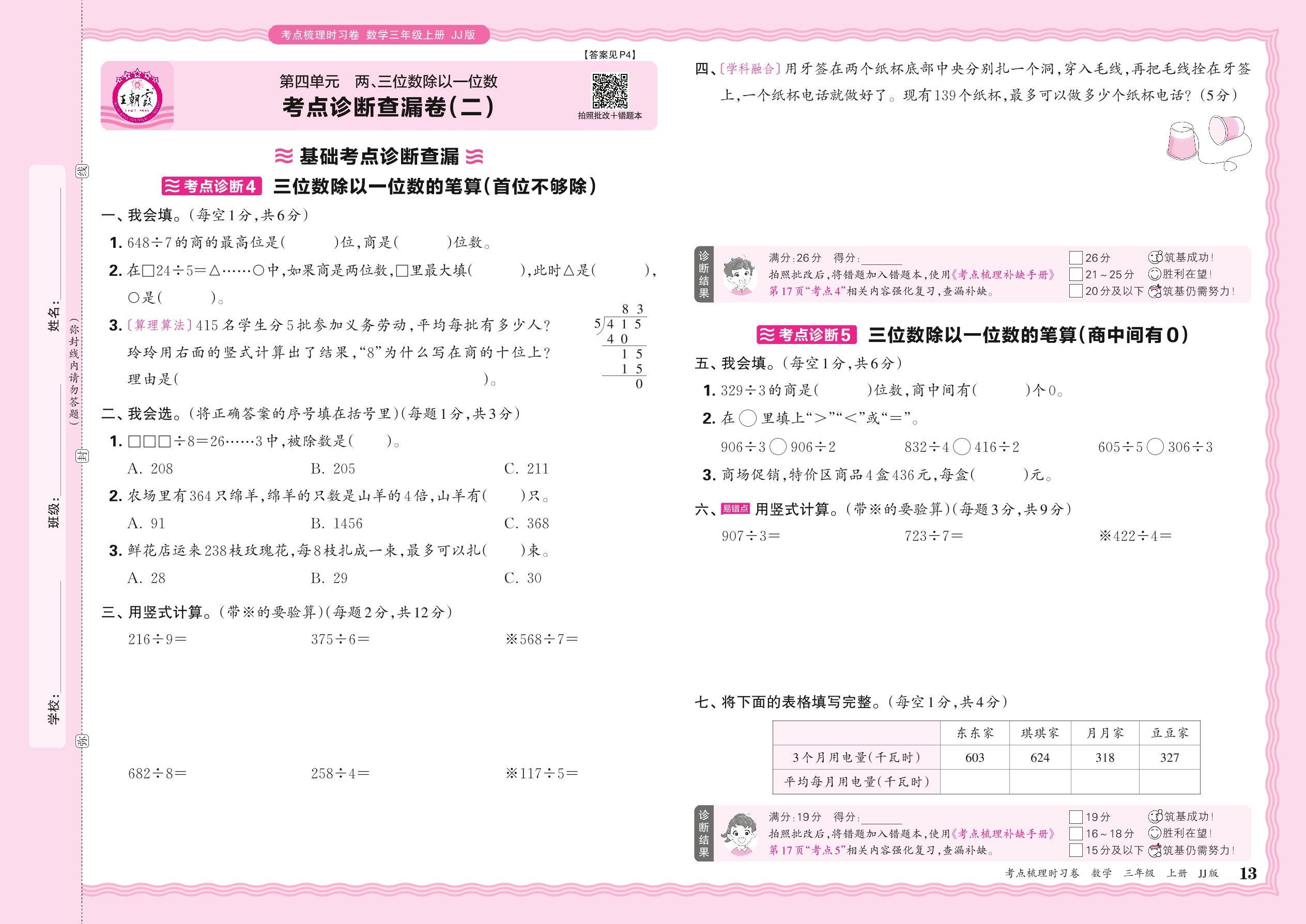 2024秋上册三年级数学冀教版 第四单元 考点诊断查漏卷(二)