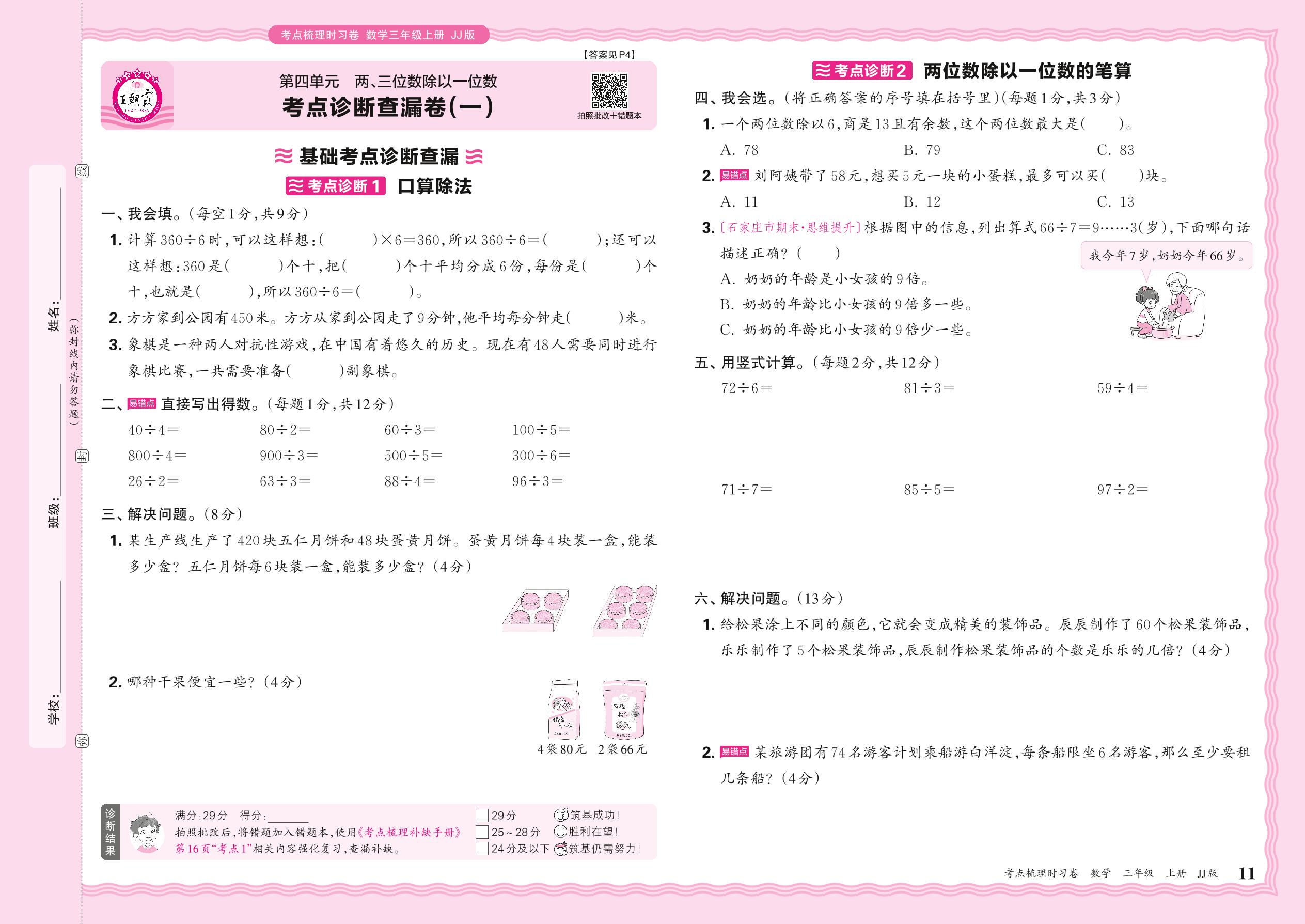 2024秋上册三年级数学冀教版 第四单元 考点诊断查漏卷(一)