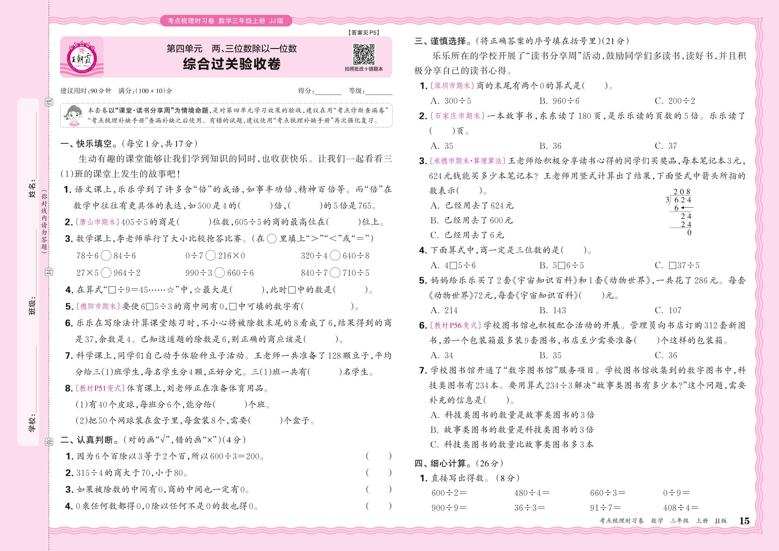 2024秋上册三年级数学冀教版 第四单元 综合过关验收卷