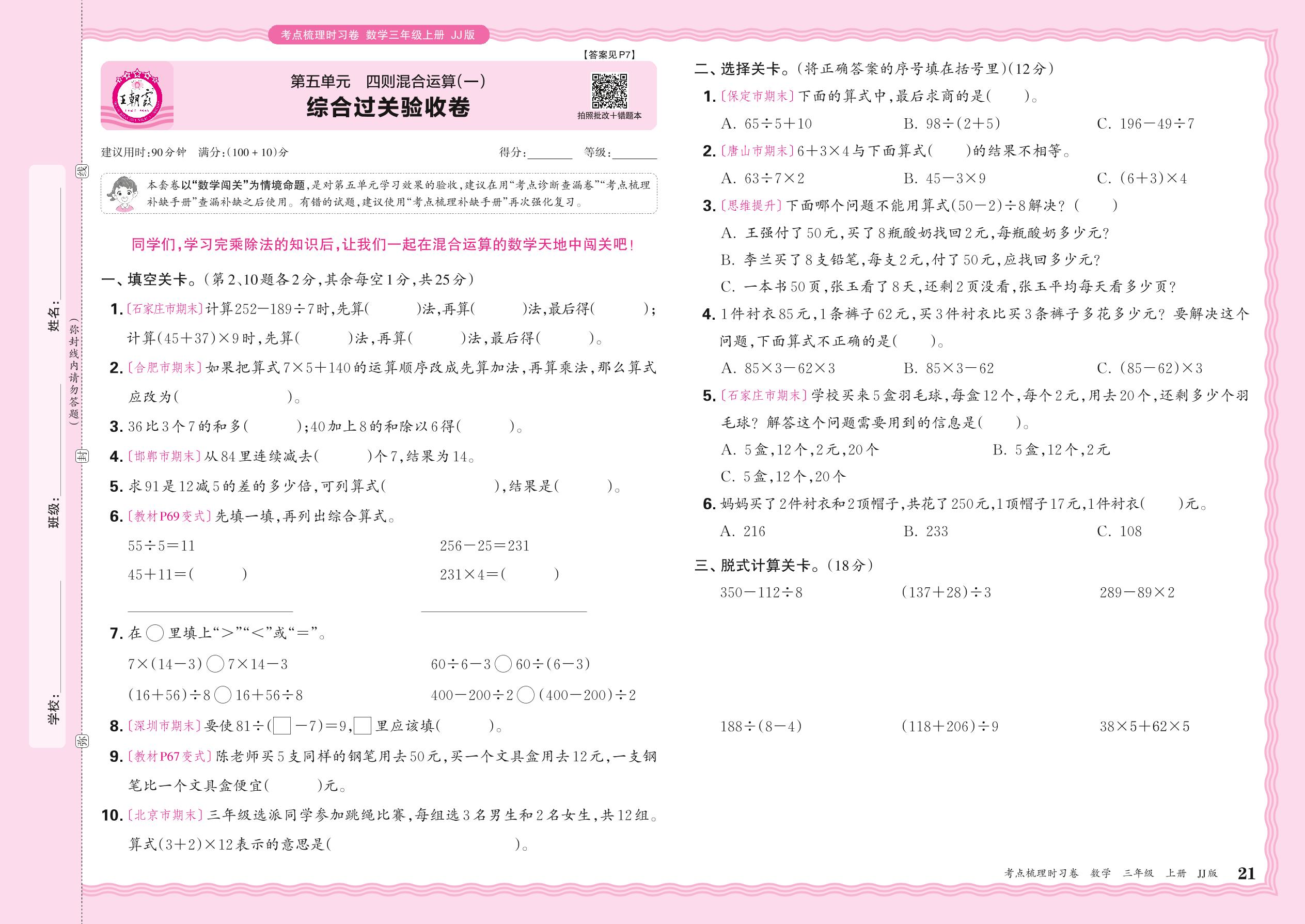 2024秋上册三年级数学冀教版 第五单元 综合过关验收卷