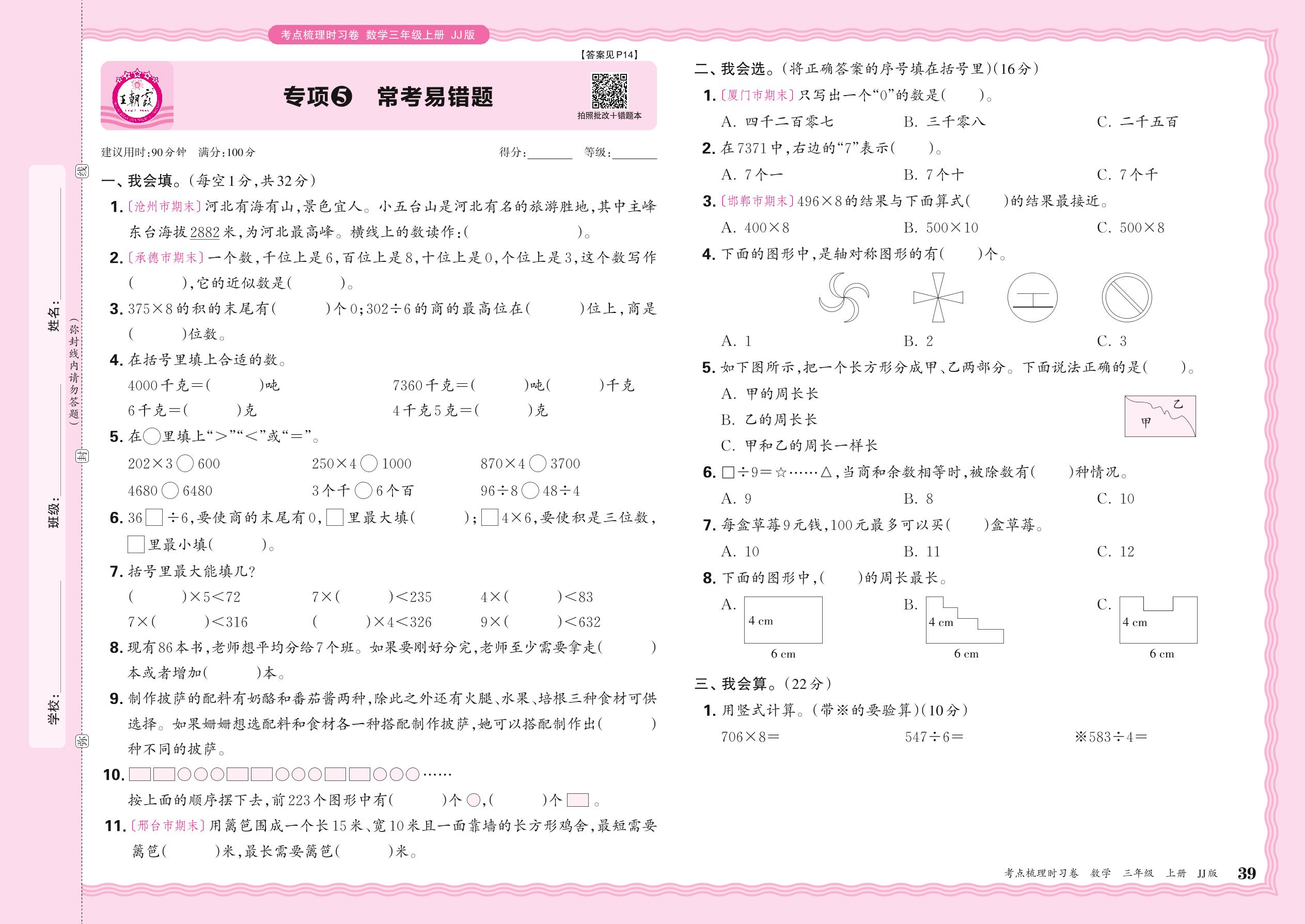 2024秋上册三年级数学冀教版 期末专项卷KD版·常考易错题【5】