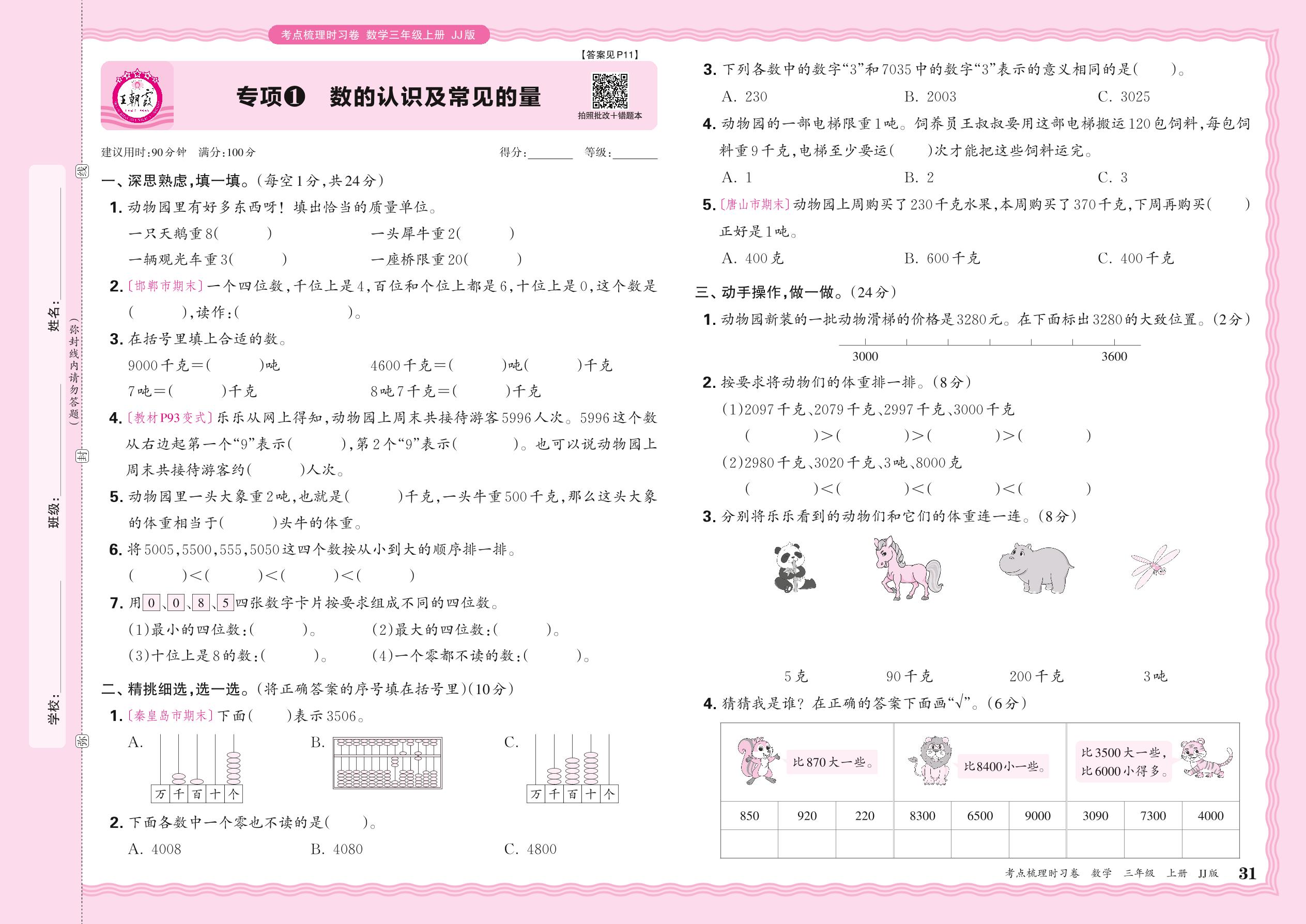 2024秋上册三年级数学冀教版 期末专项卷KD版·数的认识及常见的量【1】