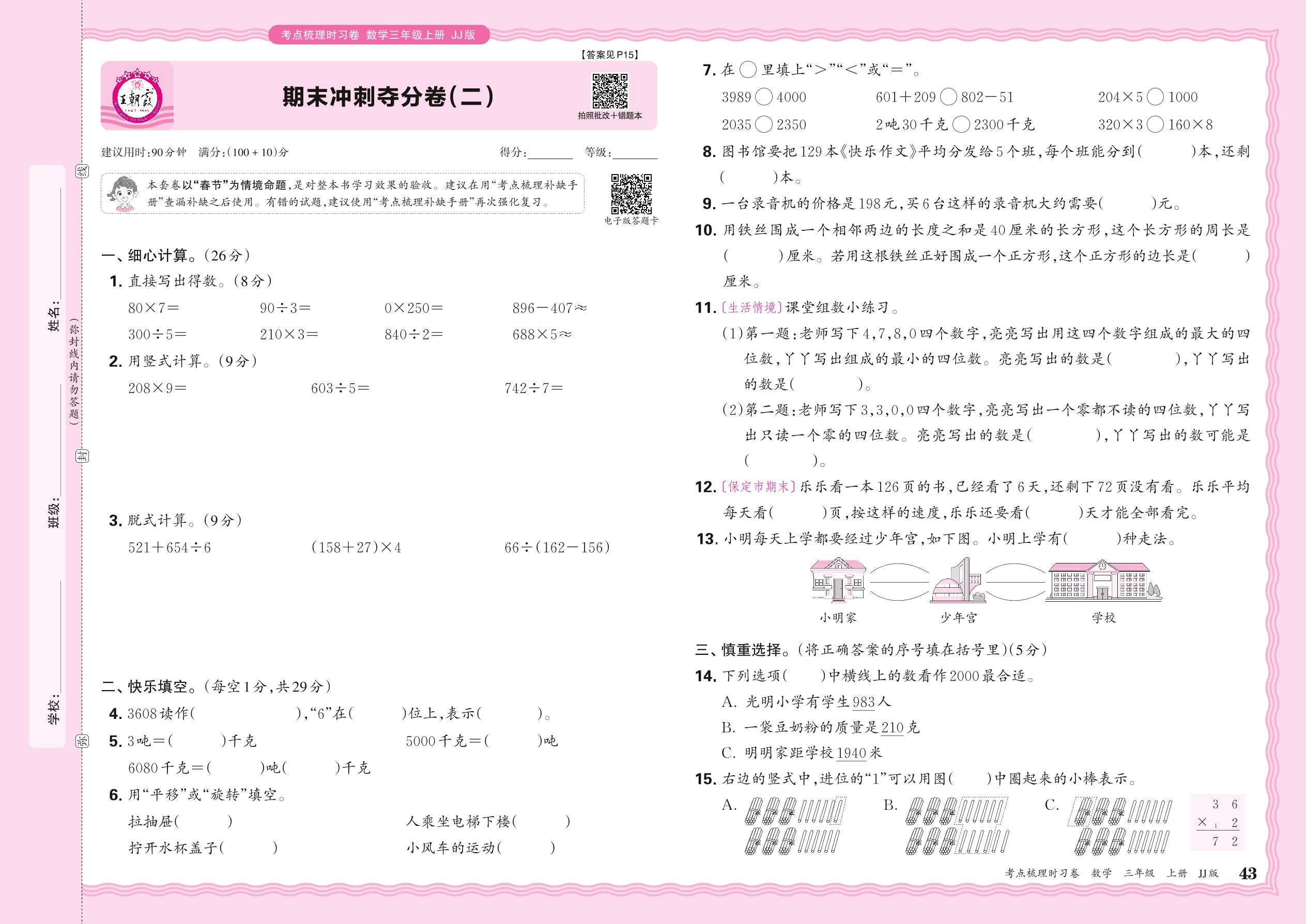 2024秋上册三年级数学冀教版 期末冲刺夺分卷(二)