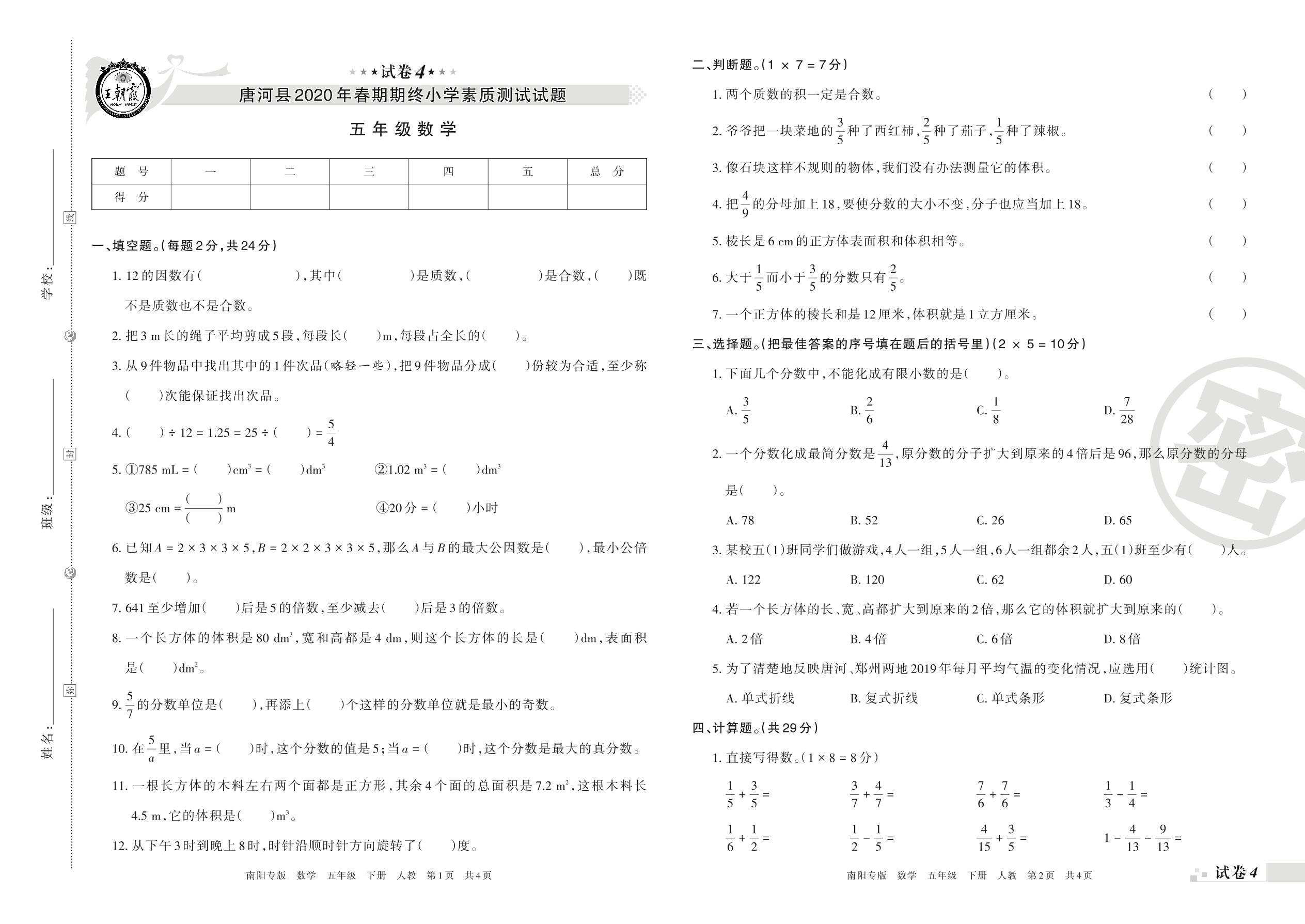 2019-2020学年第二学期南阳市唐河县五年级数学试卷(人教版)【4】