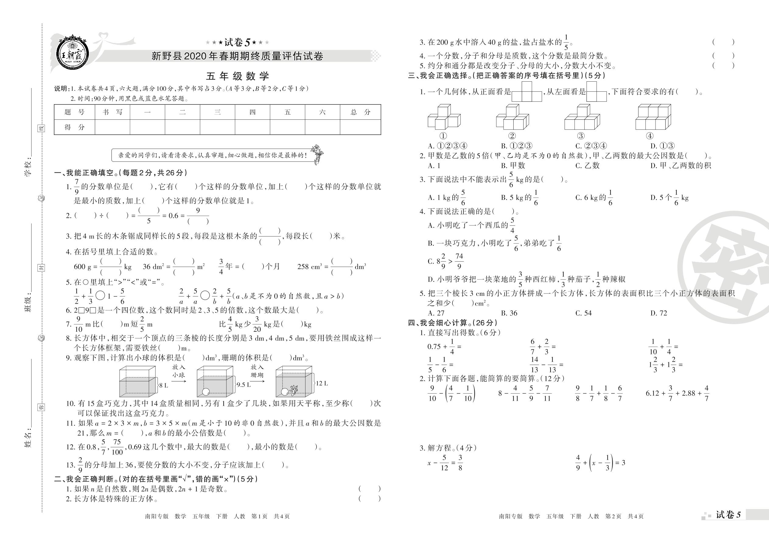 2019-2020学年第二学期南阳市新野县五年级数学试卷(人教版)【5】