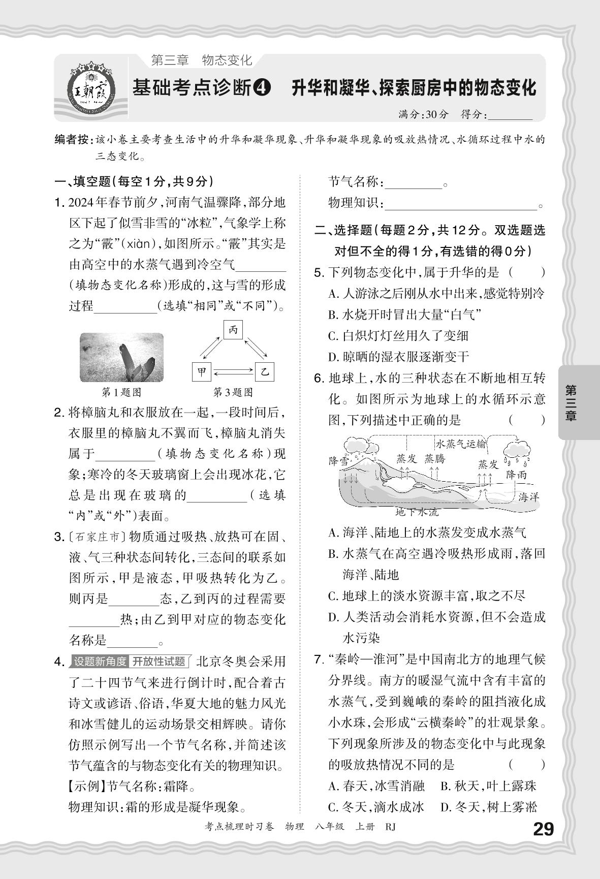 2024秋上册八年级物理人教版(2024) 第三章 基础考点诊断4 升华和凝华、探索厨房中的物态变化