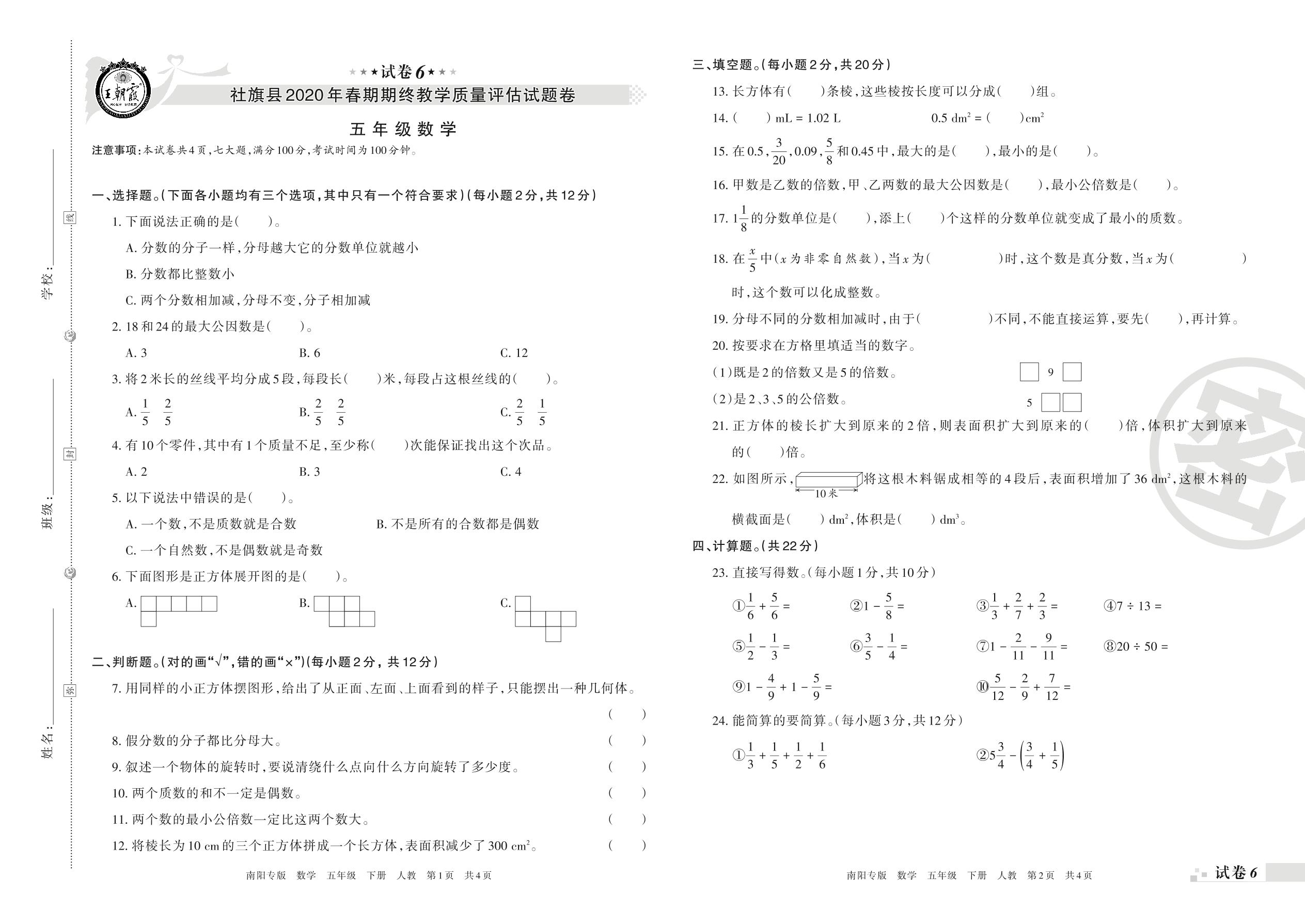 2019-2020学年第二学期南阳市社旗县五年级数学试卷(人教版)【6】
