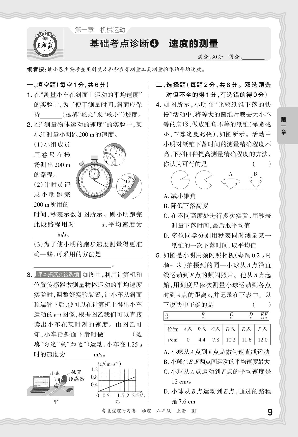 2024秋上册八年级物理人教版(2024) 第一章 基础考点诊断4 速度的测量