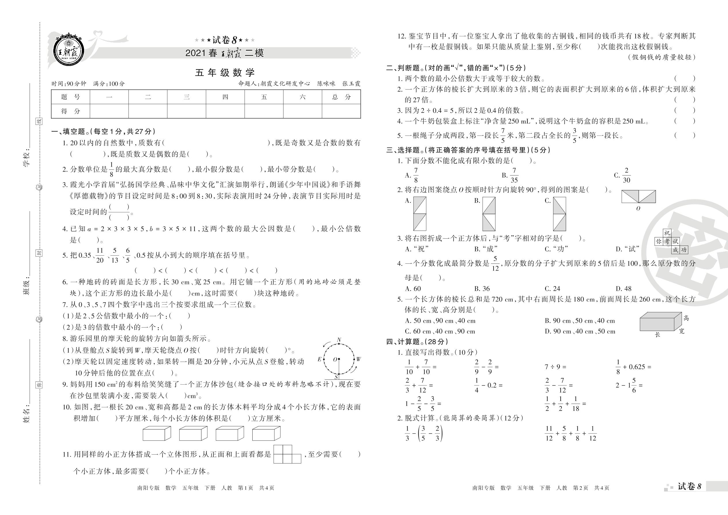 王朝霞期末模拟卷五年级下册数学(人教版)_R210804162959【8】