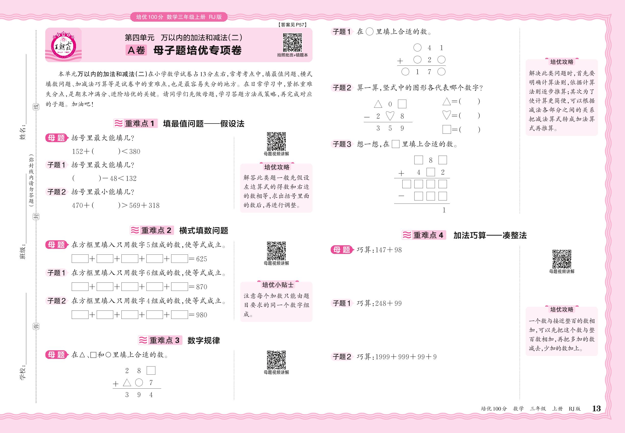 2024秋上册三年级数学人教版 第四单元A卷 母子题培优专项卷