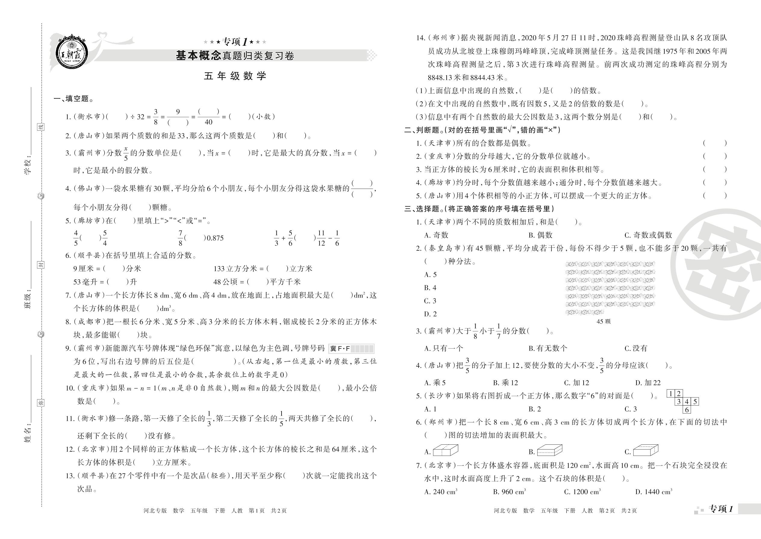 王朝霞期末专项卷——基本概念、计算真题归类复习五年级下册数学(人教版)_R210804163017【0】