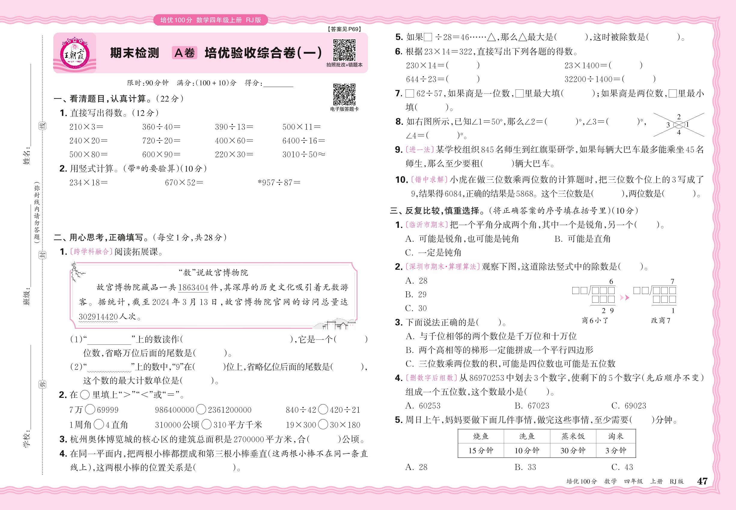 2024秋上册四年级数学人教版 期末检测A卷 培优验收综合卷(一)