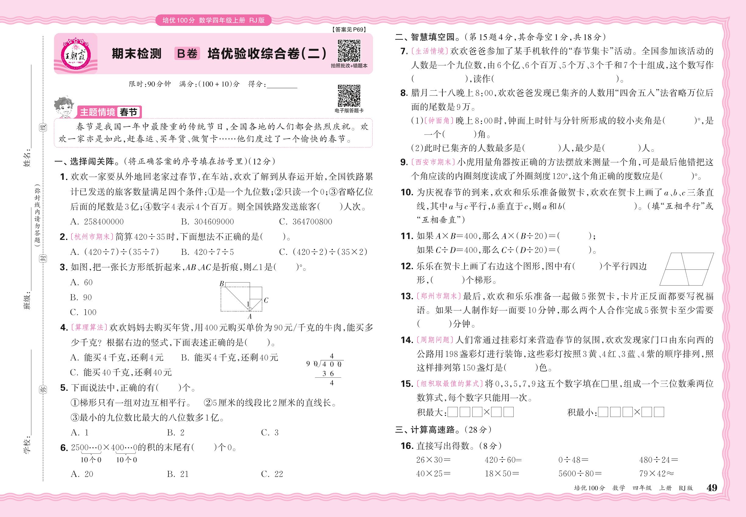 2024秋上册四年级数学人教版 期末检测B卷 培优验收综合卷(二)