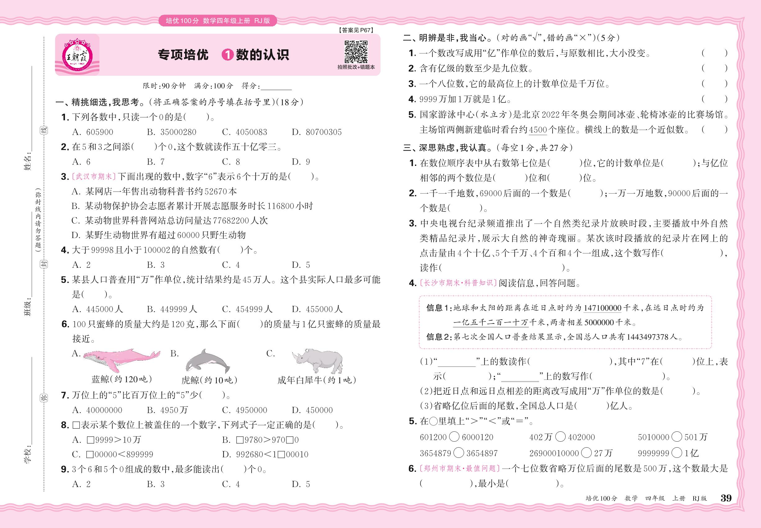 2024秋上册四年级数学人教版 期末专项卷PY版·数的认识【1】