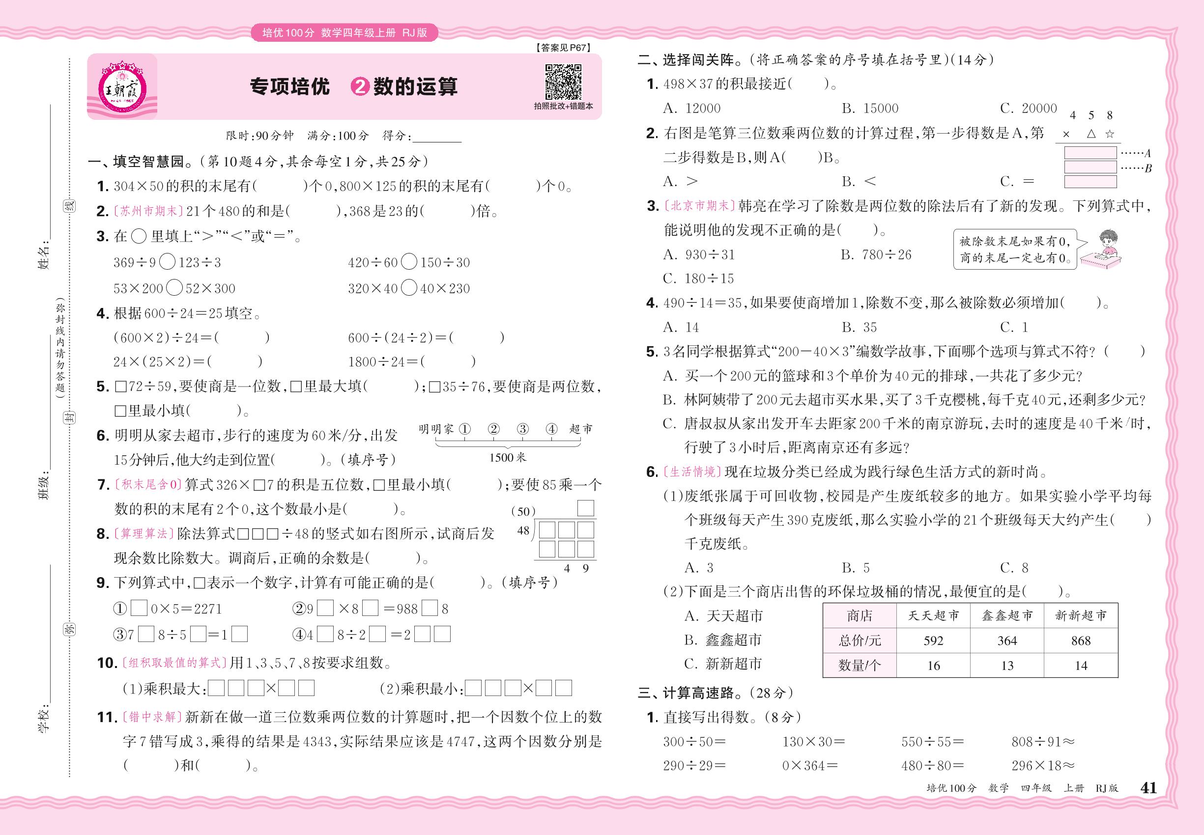 四年级数学人教版上册专项卷