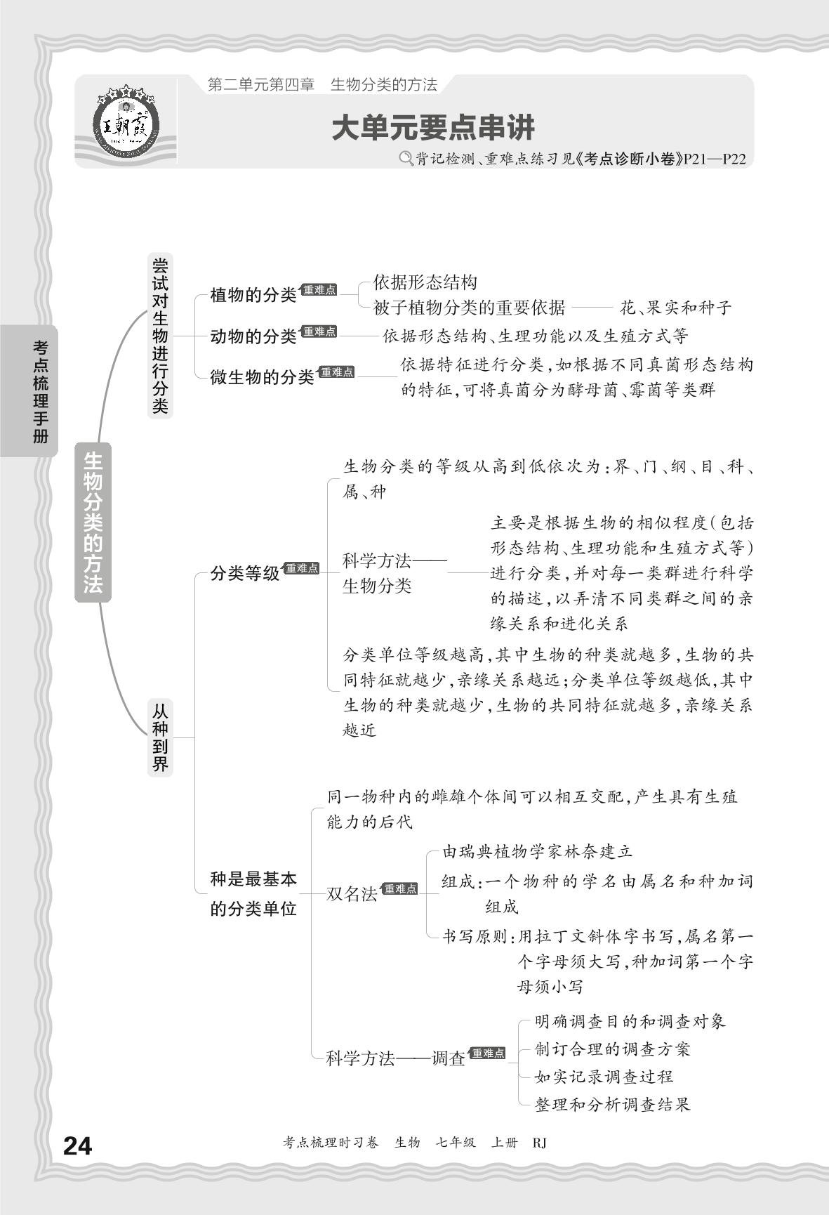 2024秋上册七年级生物人教版 考点梳理手册——第二单元第四章 生物分类的方法