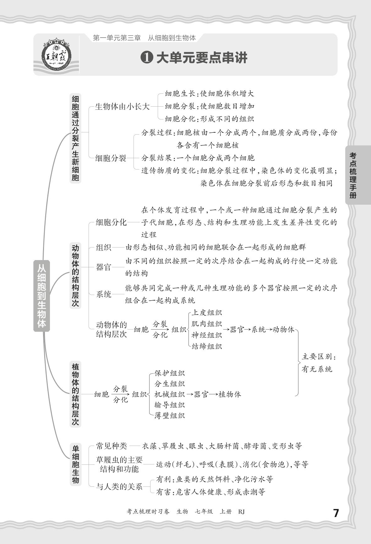 2024秋上册七年级生物人教版 考点梳理手册——第一单元第三章 从细胞到生物体