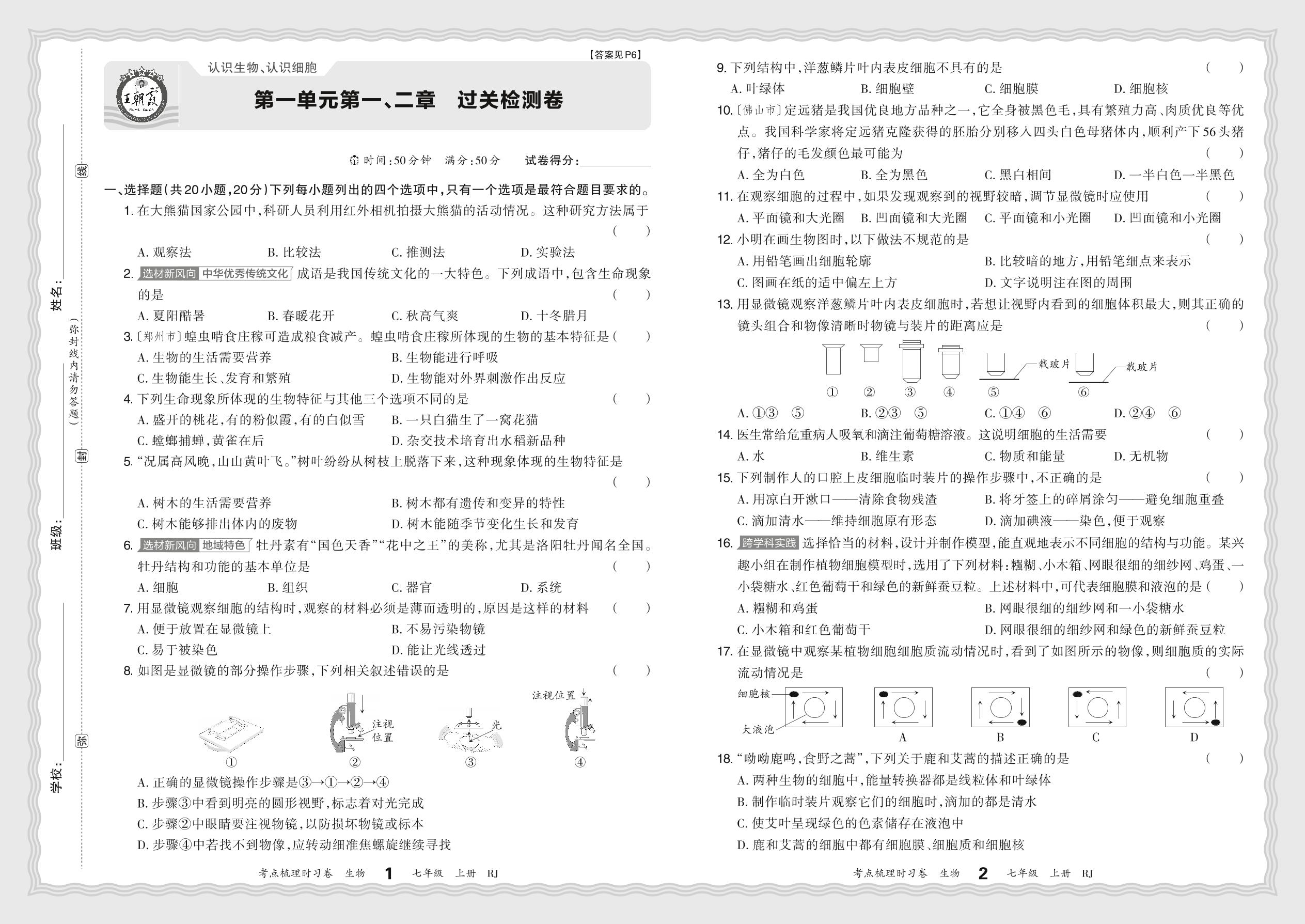 2024秋上册七年级生物人教版 第一单元第一、二章 过关检测卷