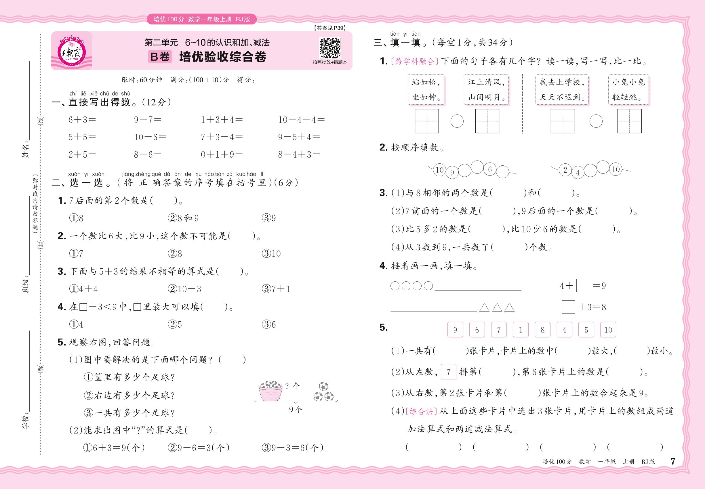 2024秋上册一年级数学人教版 第二单元B卷 培优验收综合卷