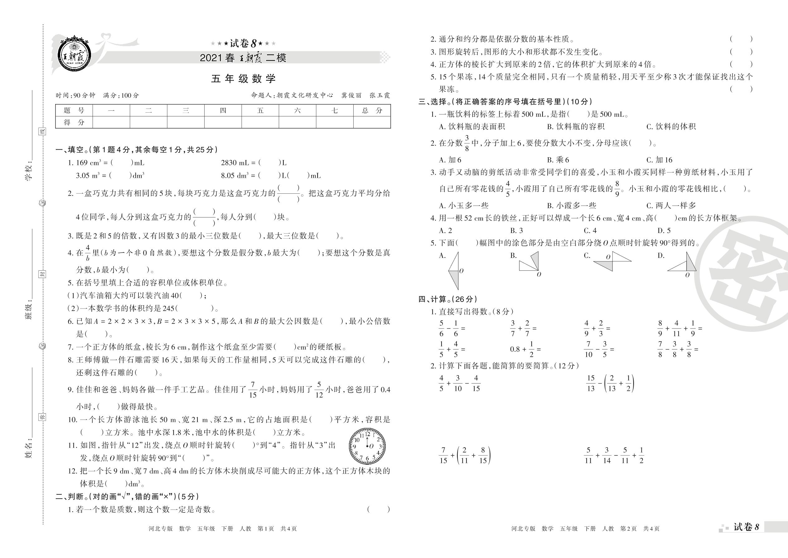 王朝霞期末模拟卷五年级下册数学(人教版)_R210804163101【8】