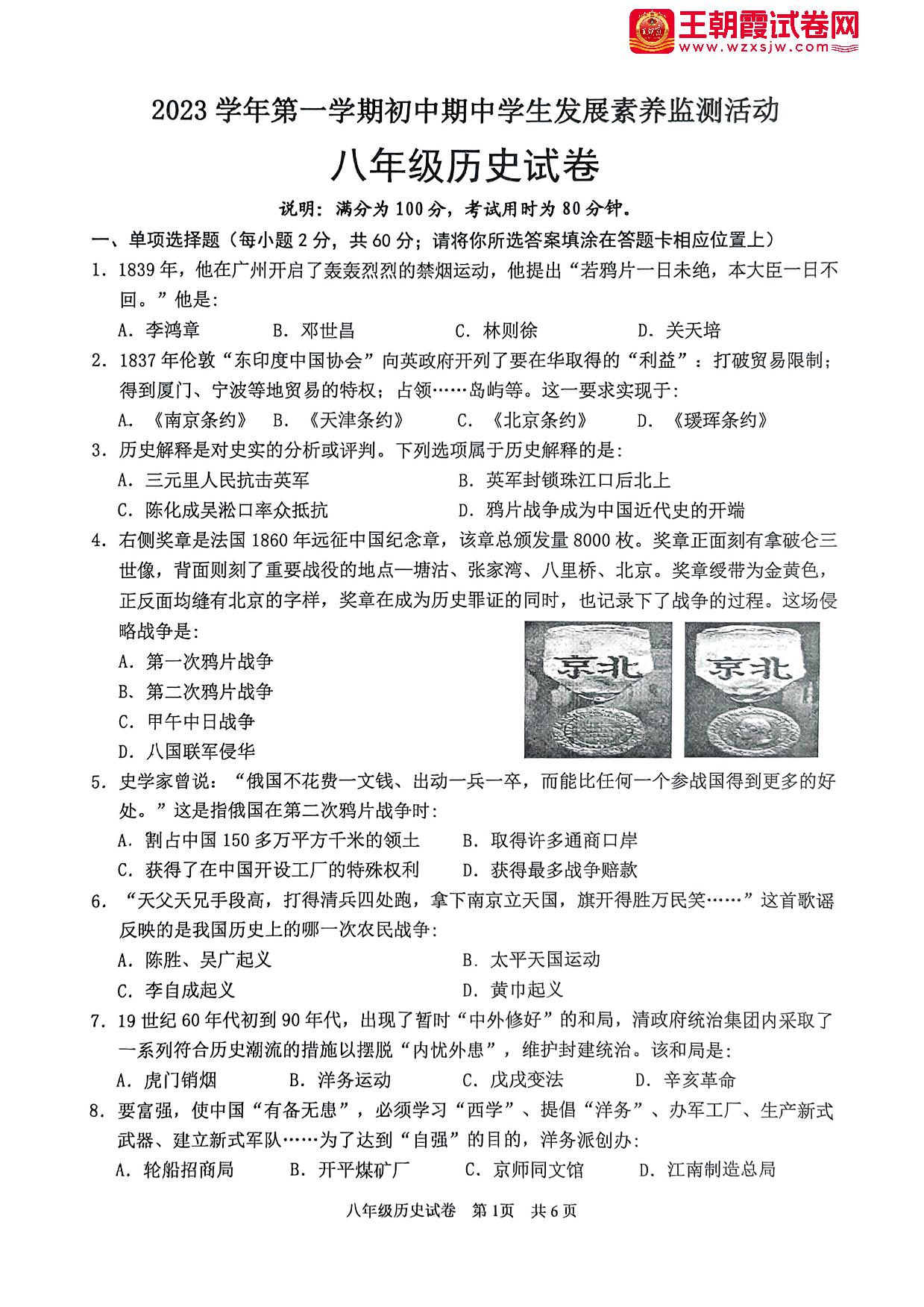 广东省清远市英德市2023-2024学年第一学期初中期中学生发展素养监测活动试卷八年级历史(人教版)