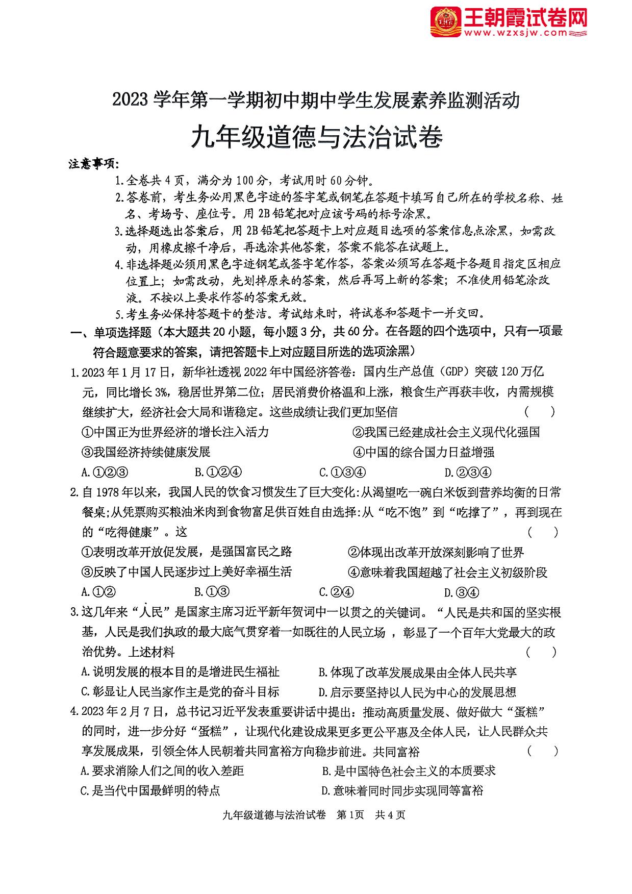 广东省清远市英德市2023-2024学年第一学期初中期中学生发展素养监测活动试卷九年级道德与法治(人教版)