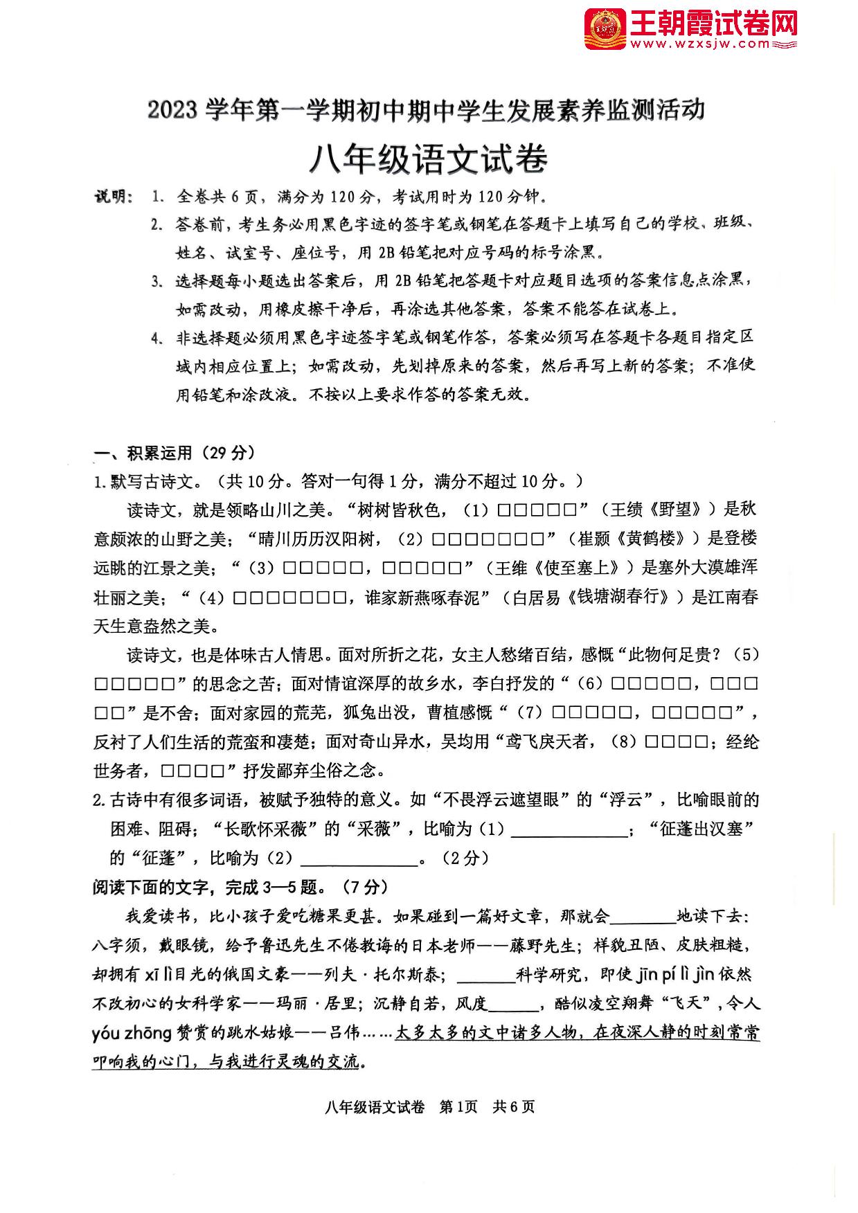 广东省清远市英德市2023-2024学年第一学期初中期中学生发展素养监测活动试卷八年级语文(人教版)