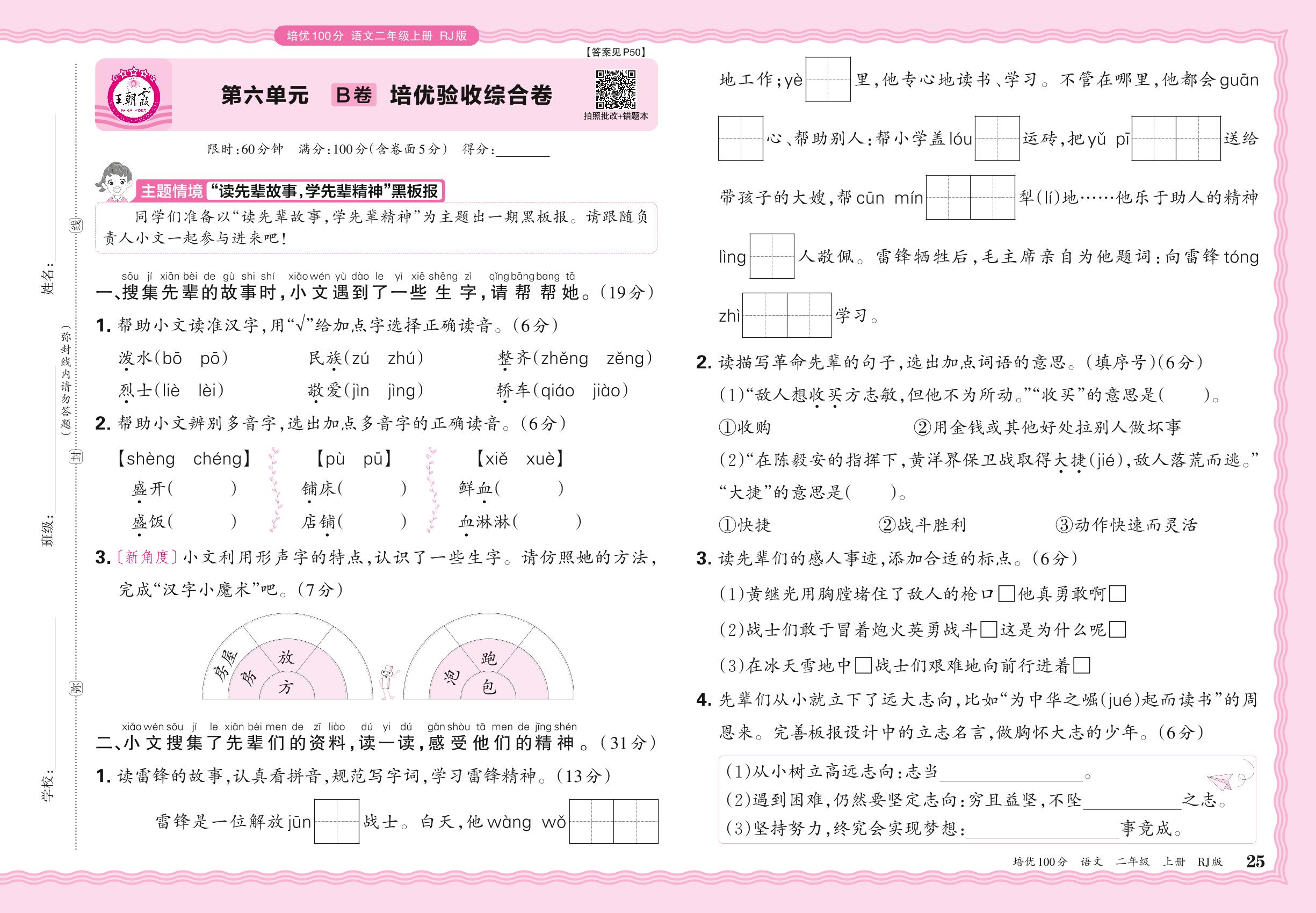 2024秋上册二年级语文人教版 第六单元B卷 培优验收综合卷