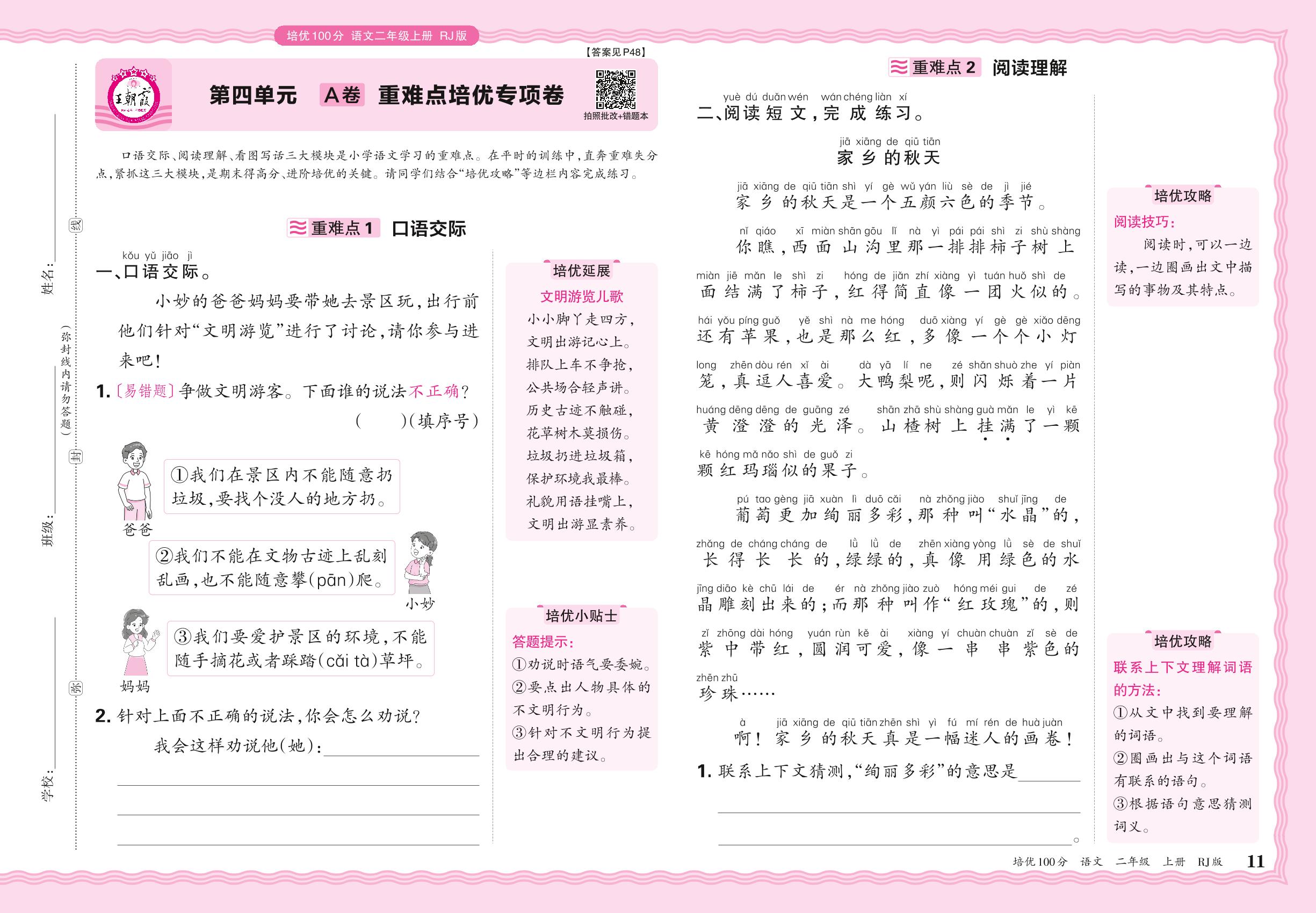 2024秋上册二年级语文人教版 第四单元A卷 重难点培优专项卷