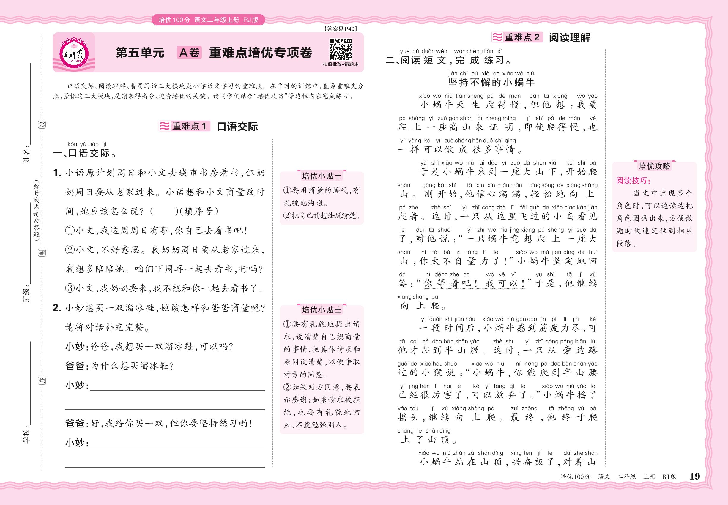 2024秋上册二年级语文人教版 第五单元A卷 重难点培优专项卷