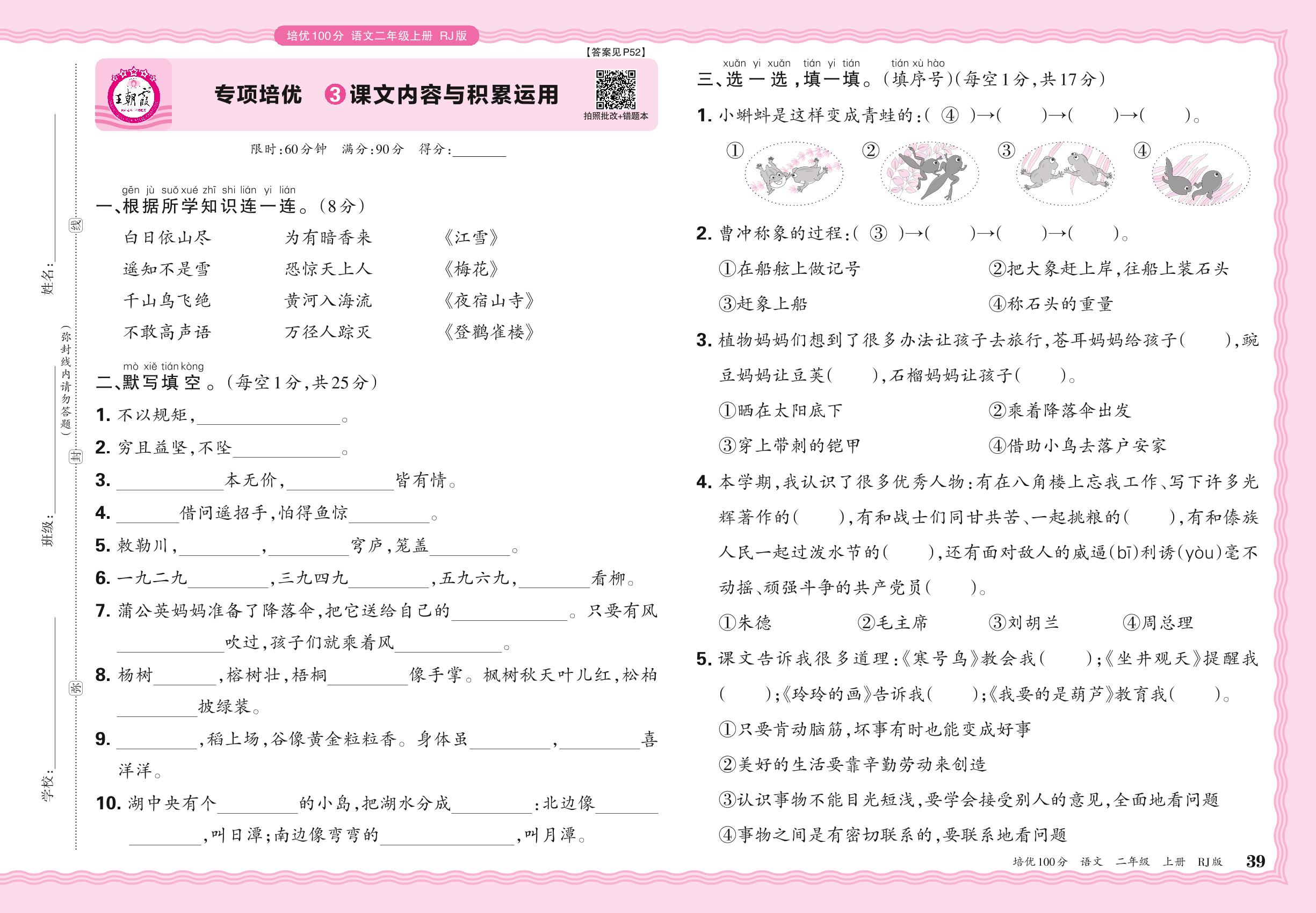 2024秋上册二年级语文人教版 期末专项卷PY版·课文内容与积累运用【3】