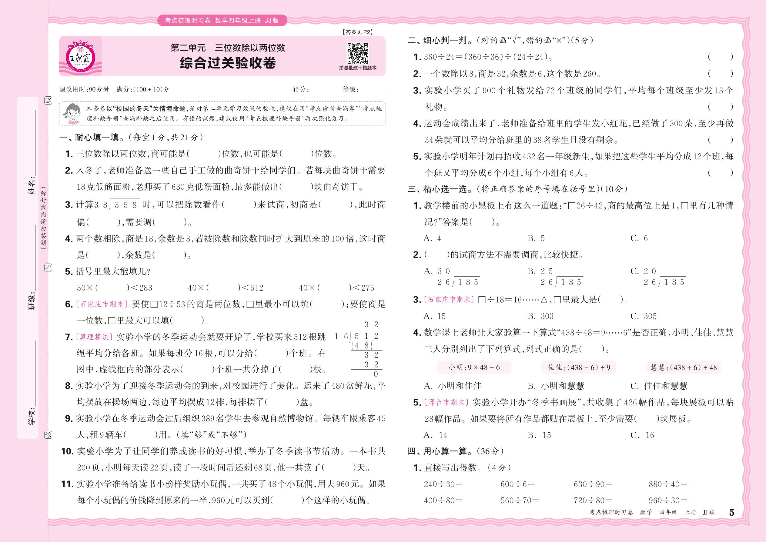 四年级数学冀教版上册单元卷